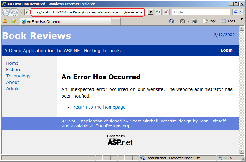 The above markup configures the application to show the Exception Details YSOD to users visiting locally, while using the custom error page Oops.aspx for those users visiting remotely. To see this in action, deploy your website to the production environment and then visit the Genre.aspx page on the live site with an invalid querystring value. You should see the custom error page (refer back to Figure 3).