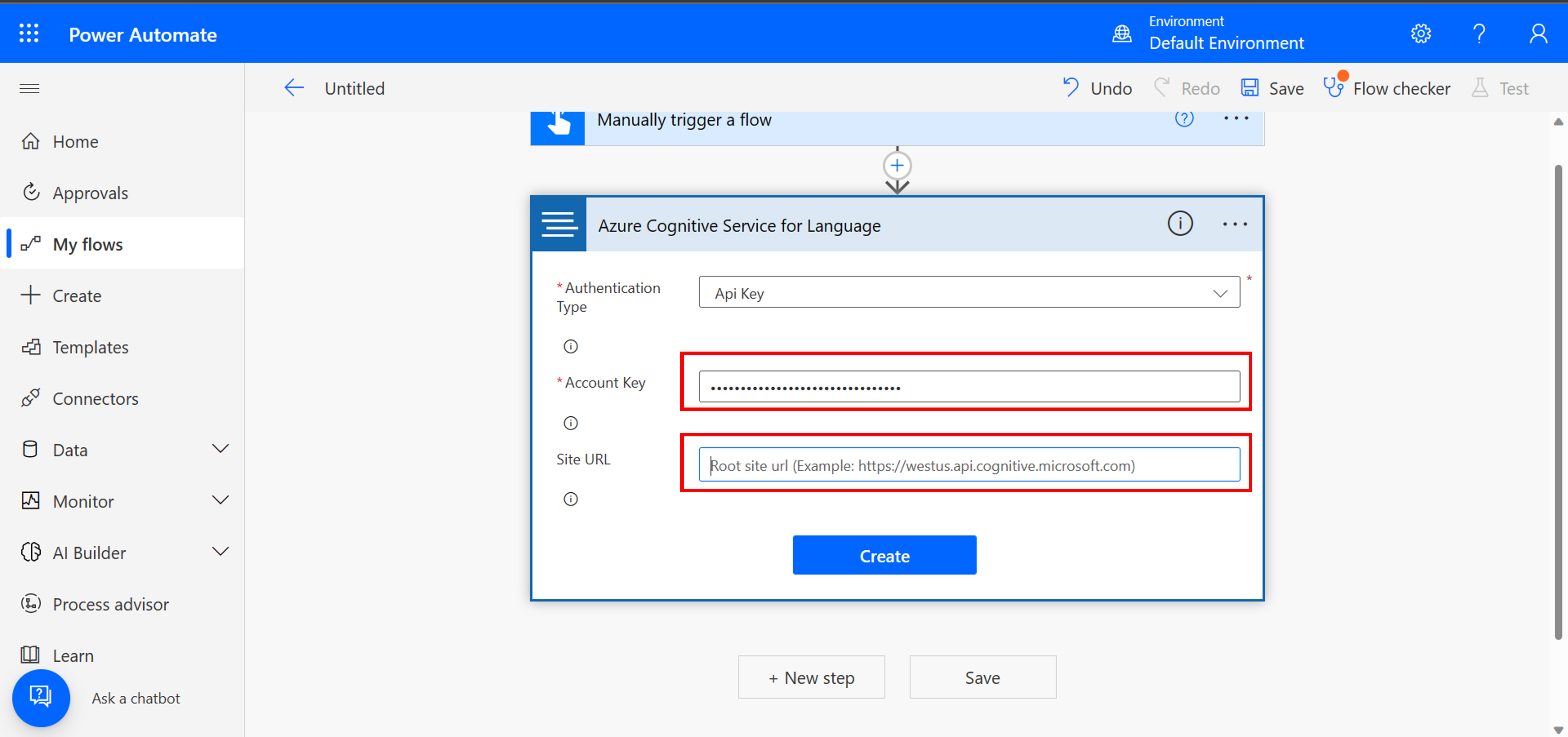 Once you have your key and endpoint, add it to the connector in Power Automate.