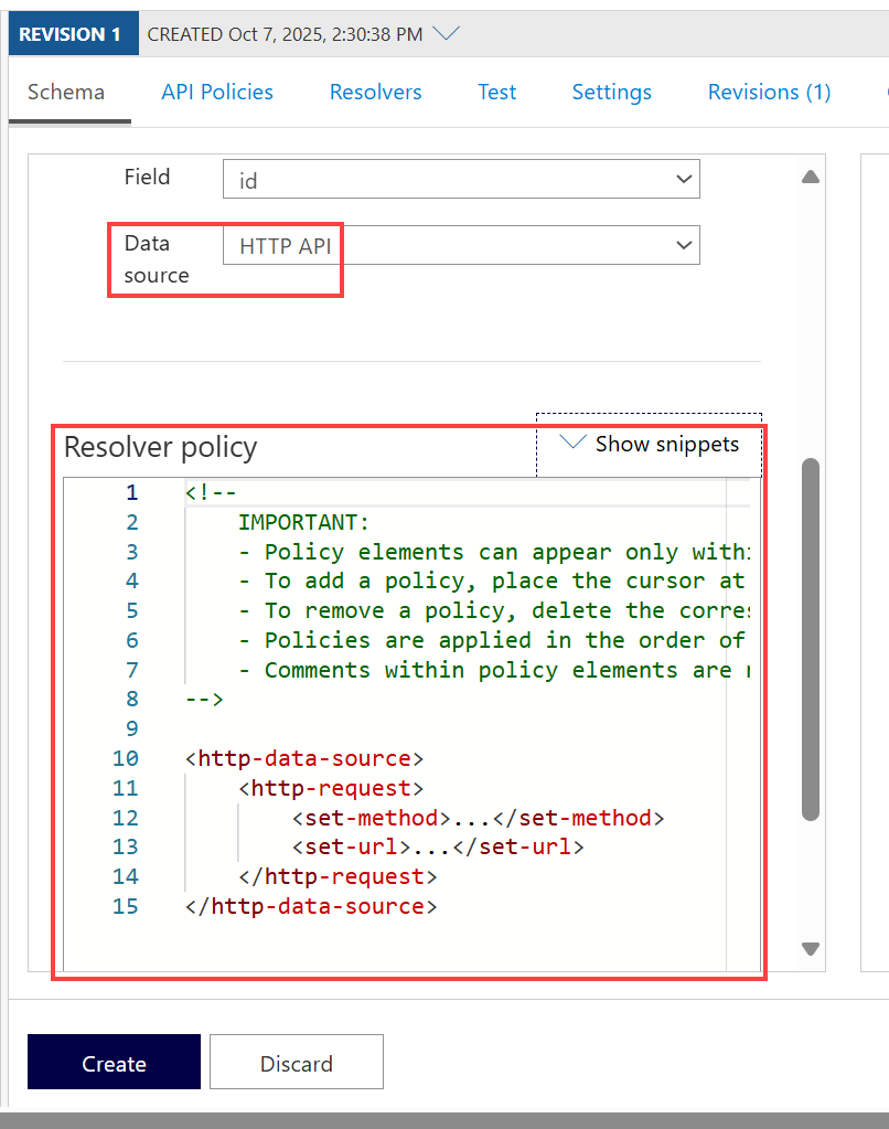 <http-data-source>element with child elements for your scenario. For example, the following resolver retrieves theusersfield by making aGETcall to an existing HTTP data source.<http-data-source> <http-request> <set-method>GET</set-method> <set-url>https://myapi.contoso.com/users</set-url> </http-request> </http-data-source>Select Create.