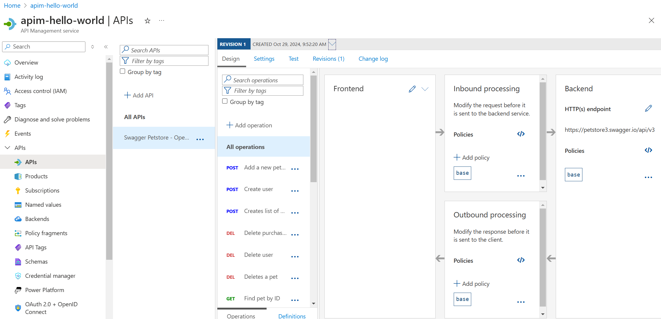 1. In your API Management instance, select APIs > APIs > Swagger Petstore.
