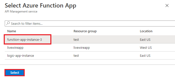 Select the functions that you want to import and click Select. You can only import functions that have an HTTP trigger and an Anonymous or Function authorization level.