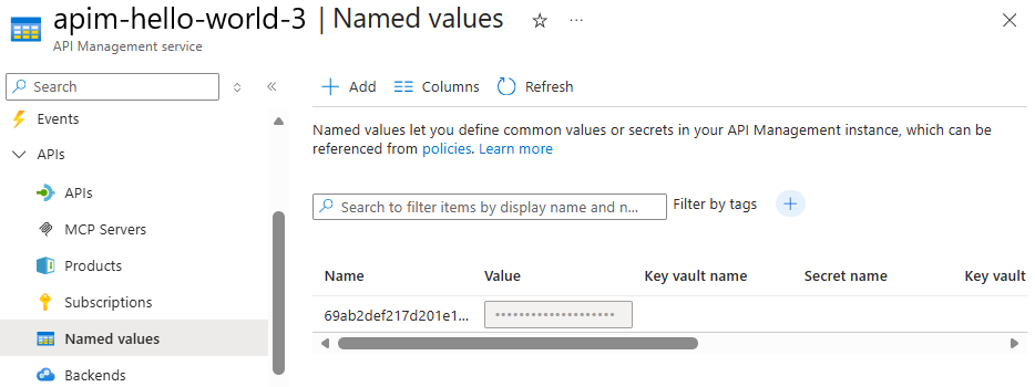 apim-<your API Management service instance name>. - A named value in the API Management instance that has the name