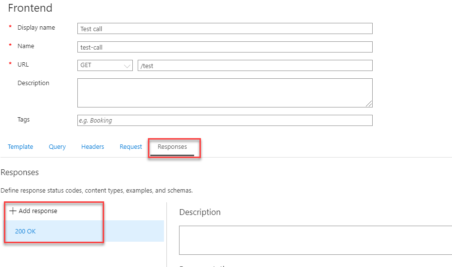 Setting Value Description Display name Test call The name displayed in the developer portal. Name test-call This field fills automatically. URL (first box) GET Select one of the predefined HTTP verbs. URL (second box) /test A URL path for the API. Description An optional description of the operation. It provides documentation in the developer portal to the developers who use the API. Select the Responses tab, which is located under the URL, Display name, and Description boxes. Enter values on this tab to define response status codes, content types, examples, and schemas.
