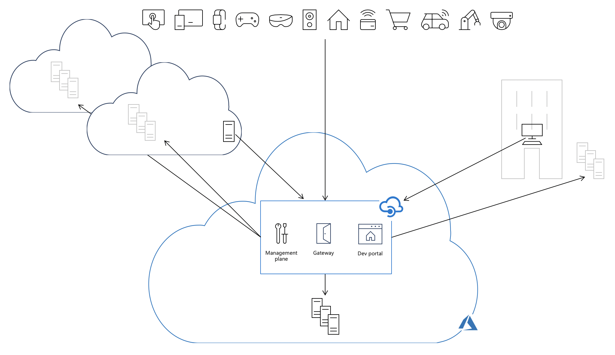 By default, all these components are deployed on Azure, causing all API traffic (shown as solid black arrows in the following image) to flow through Azure regardless of where backends implementing the APIs are hosted. The operational simplicity of this model comes at the cost of increased latency, compliance issues, and in some cases, extra data transfer fees.