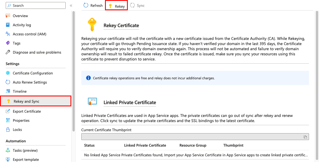 On the App Service Certificates page, select the certificate. On the left pane, select Rekey and Sync.