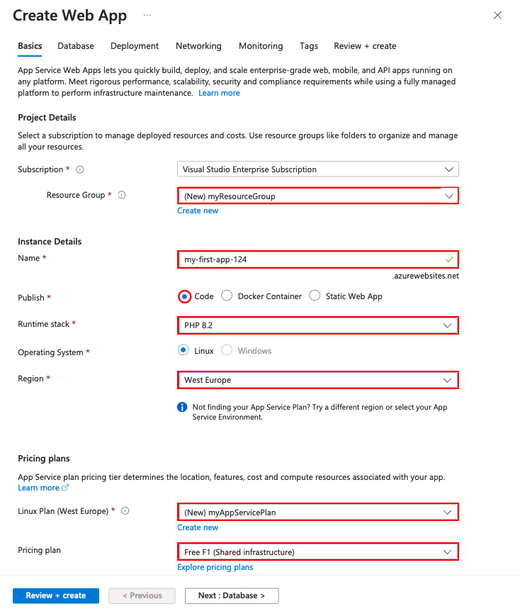 --runtime "PHP:8.2"argument creates the web app with PHP version 8.2. - The