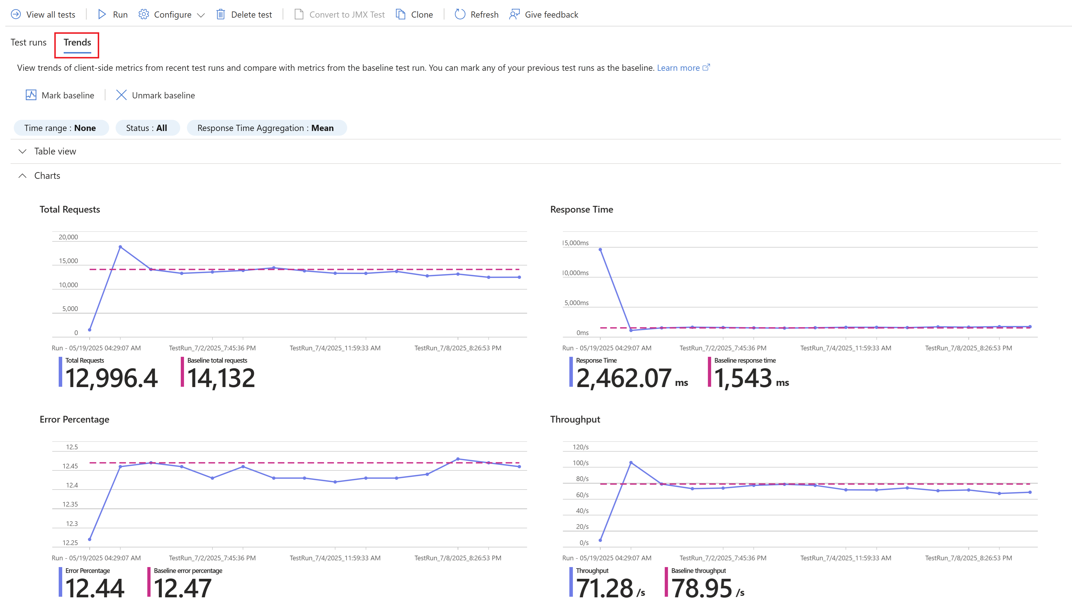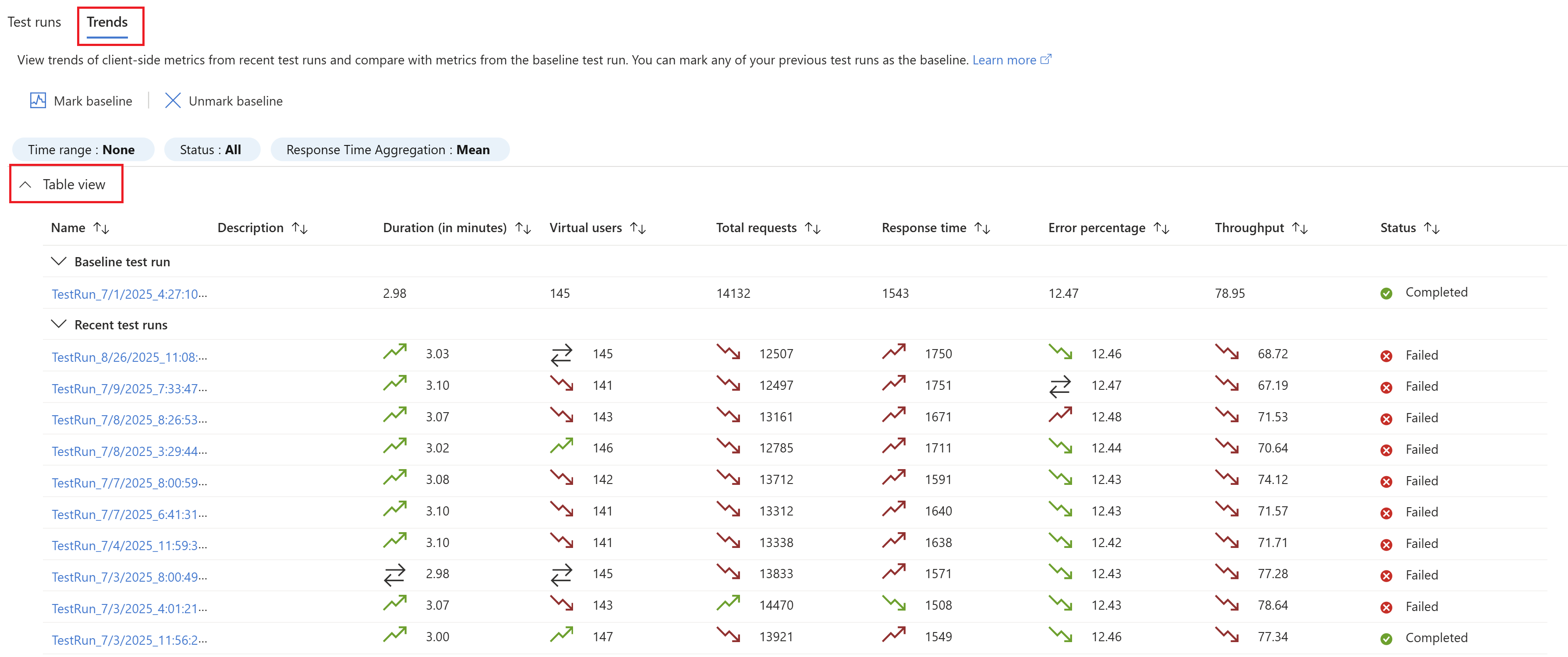 You can mark a test run as a baseline to compare the client-side metrics of the recent test runs with the metrics of the baseline.