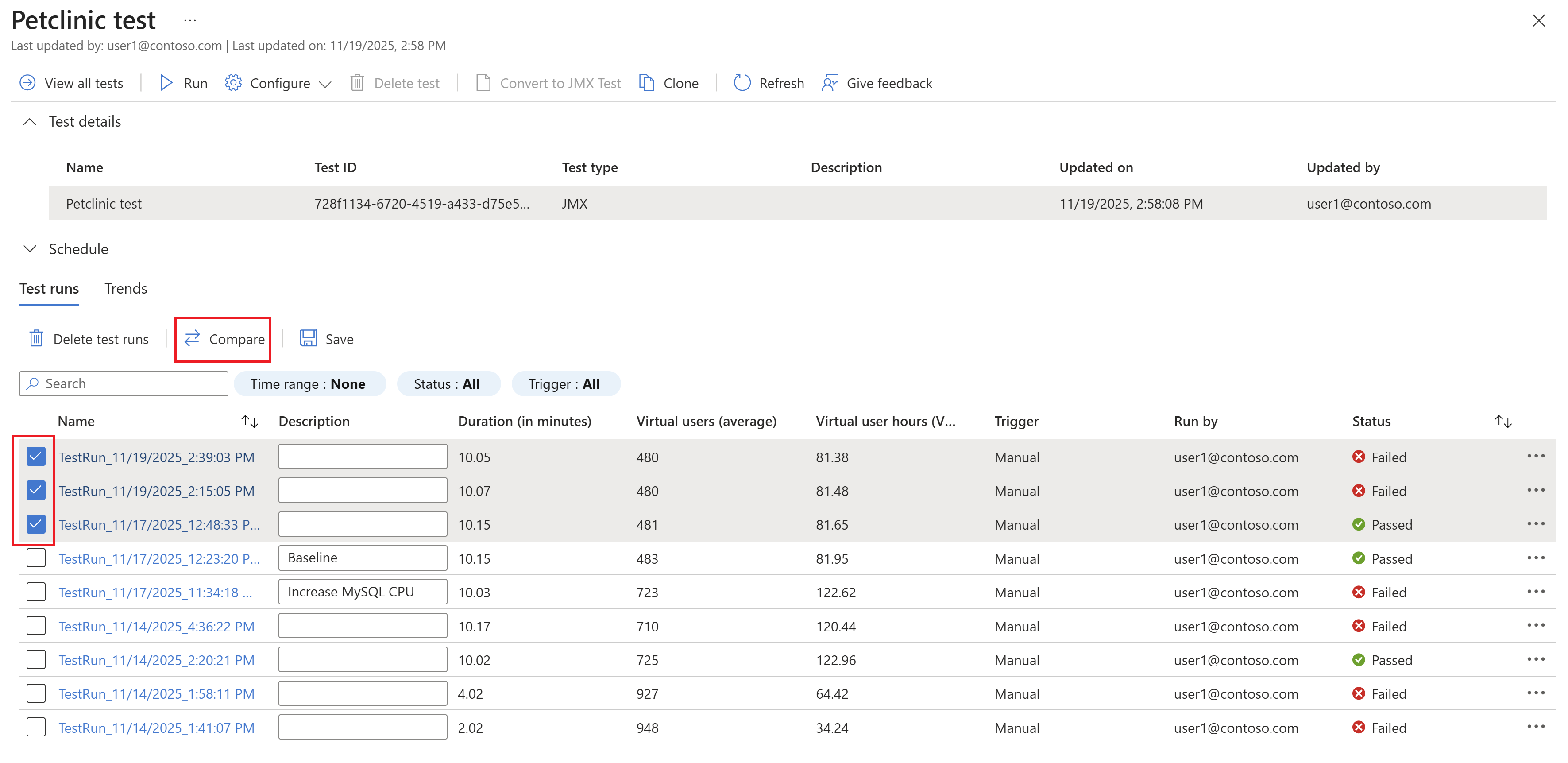 In this article, you learn how you can compare test runs in Azure Load Testing. You can view trends across the last few test runs, or you can select and compare up to 10 individual test runs. Optionally, you can mark a test run as a baseline to compare against.