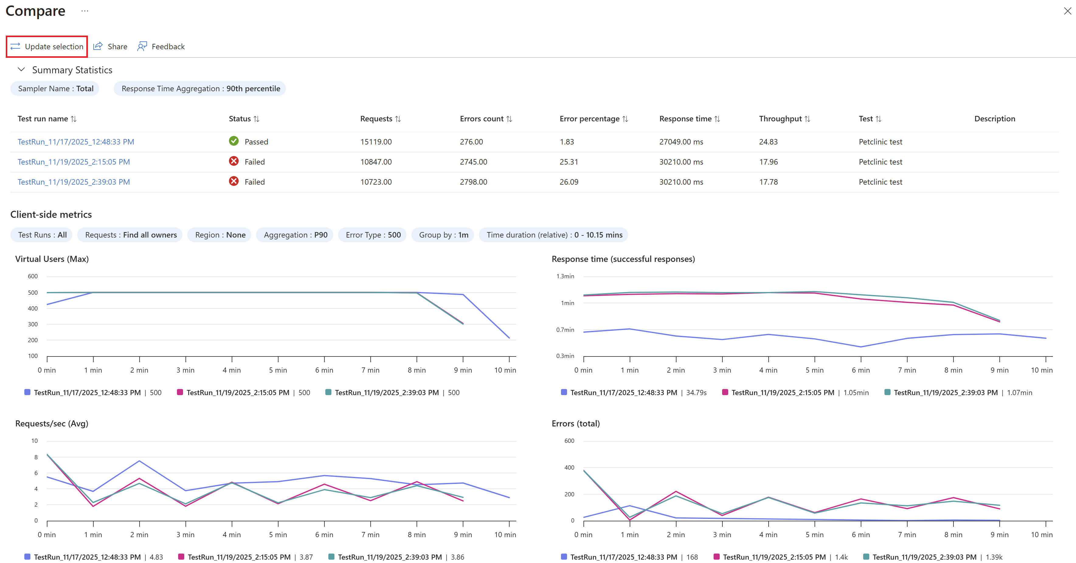Optionally, you can change the test runs selected for comparison by selecting 'Update selection'. You can select test runs from the same load test or from a different one.