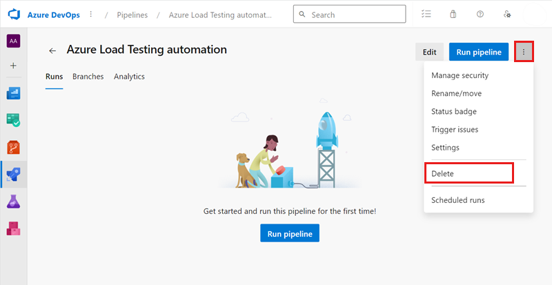 Screenshot that shows how to delete an Azure Pipelines definition.