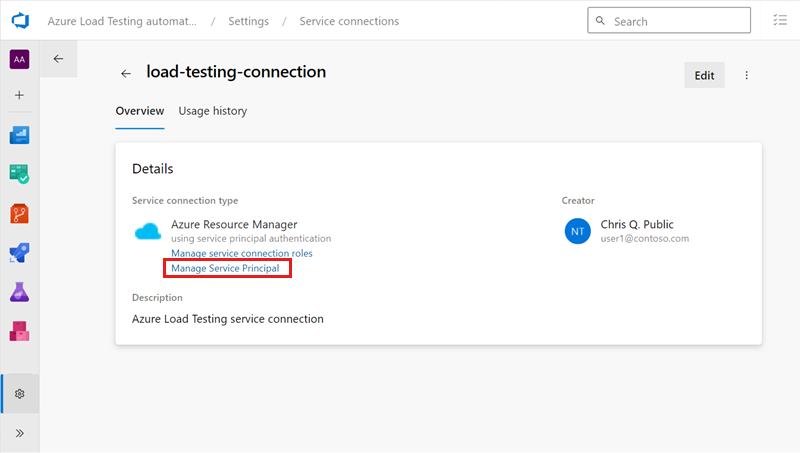 6. From the list of service connections, select the one you created earlier, and then select Manage Service Principal.