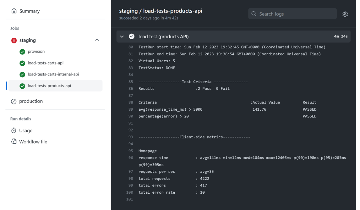 A load test might run the test script until the end, but might not pass all the test fail criteria. If at least one of the test criteria didn't pass, the status of the test run is set to Failed.