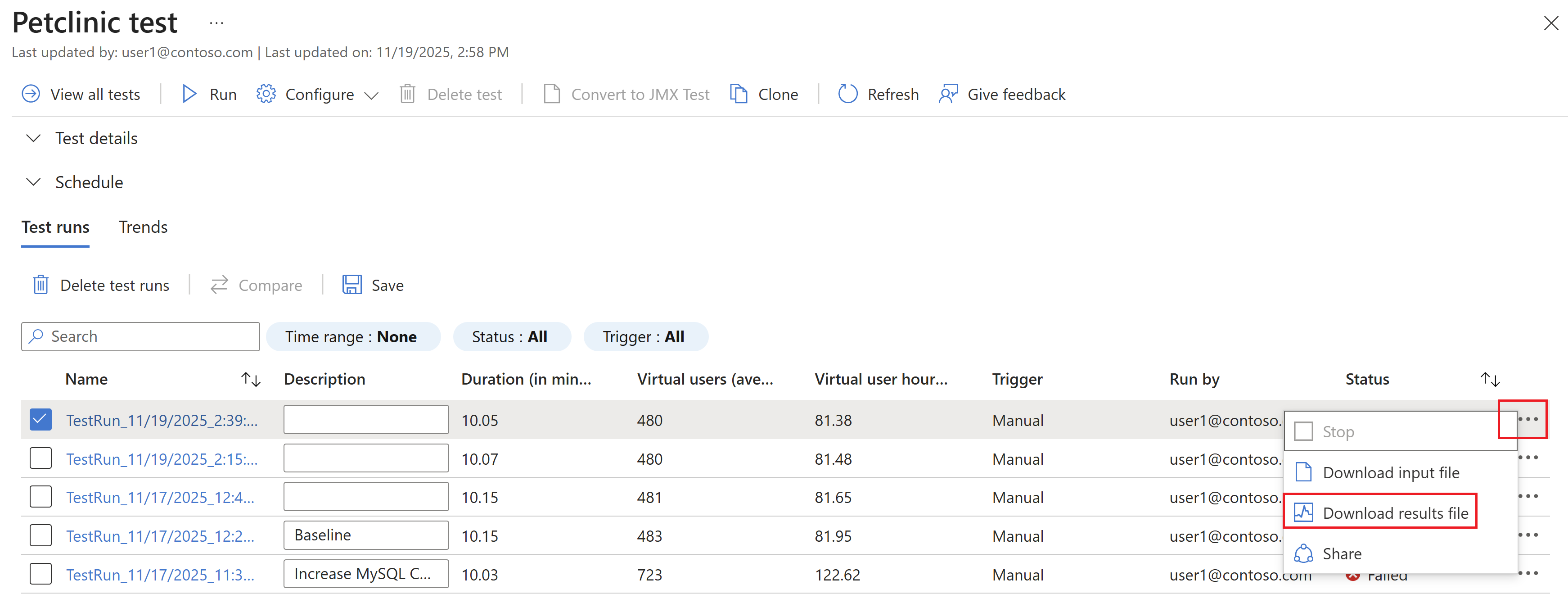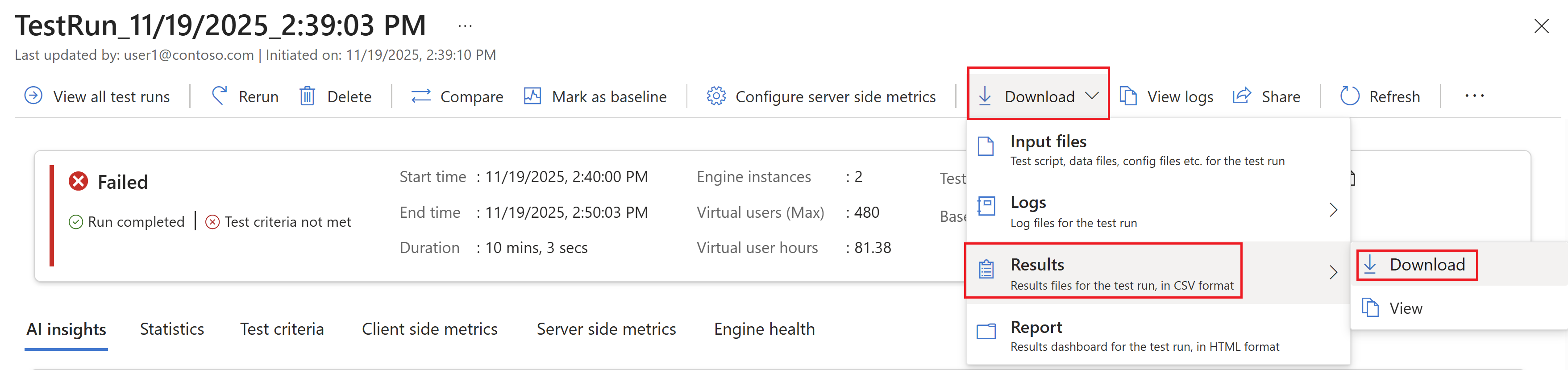 Select the ellipsis (...) next to the load test run you're working with, and then select Download results file.