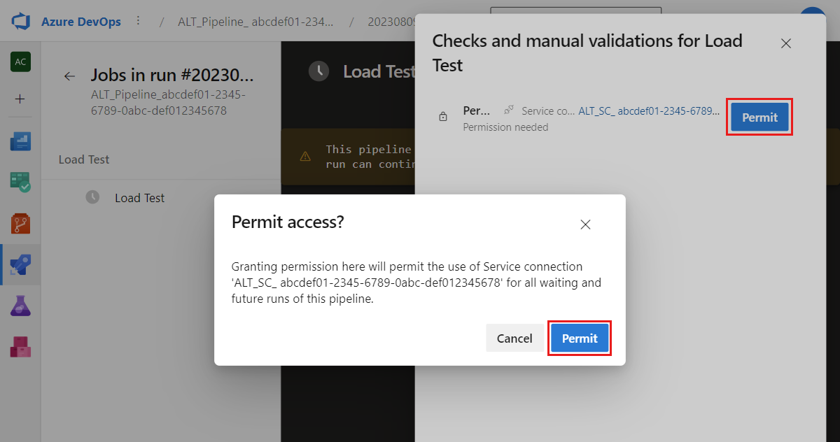 When you run the CI/CD pipeline for the first time, you need to grant permission to the pipeline to access the service connection and start the load test.