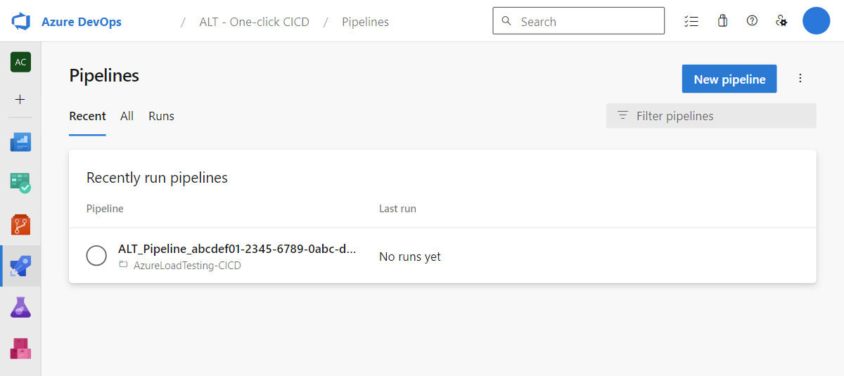 In this section, you'll create a CI/CD pipeline in Azure Pipelines to run an existing load test. The test files like test script and test configuration YAML will be committed to your repository.