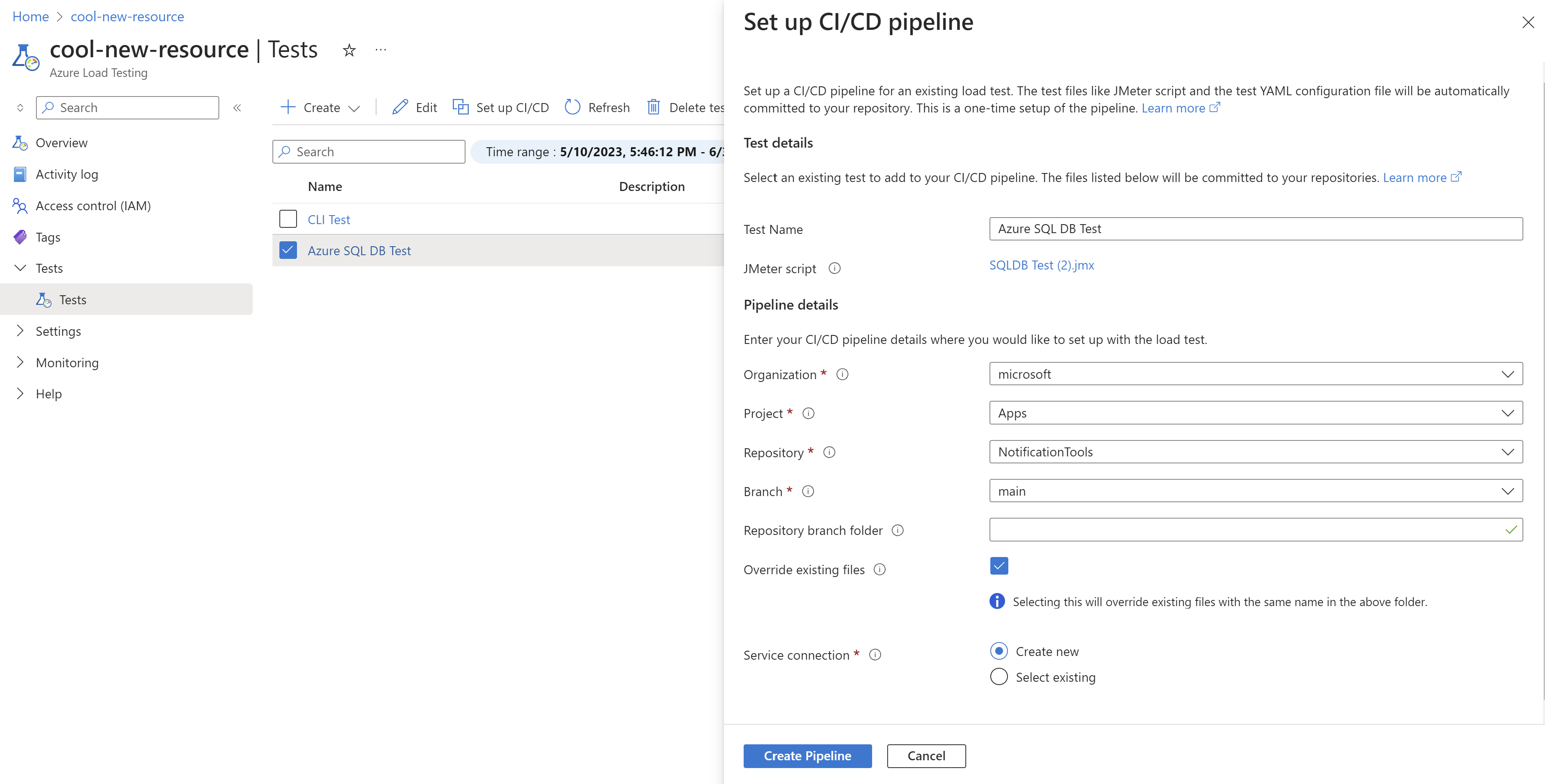 Setting Value Organization Select the Azure DevOps organization where you want to run the pipeline from. Project Select the project from the organization selected above. Repository Select the source code repository to store and run the Azure pipeline from. Branch Select the branch in the selected repository. Repository branch folder (Optional) Enter the repository branch folder name in which you'd like to commit. If empty, the root folder is used. Override existing files Check this setting. Service connection Select Create new to create a new service connection to allow Azure Pipelines to connect to the load testing resource.