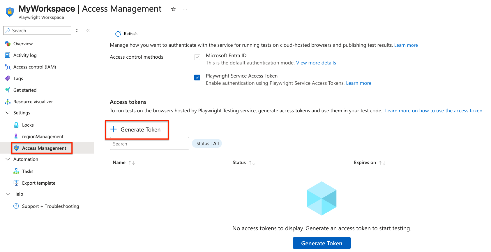 Create an access token to authorize access to your Playwright workspace, and to run existing Playwright tests in your workspace. You can create multiple access tokens for your workspace. When you create an access token, you have to specify an expiration date for the token. After a token expires, you need to create a new access token.