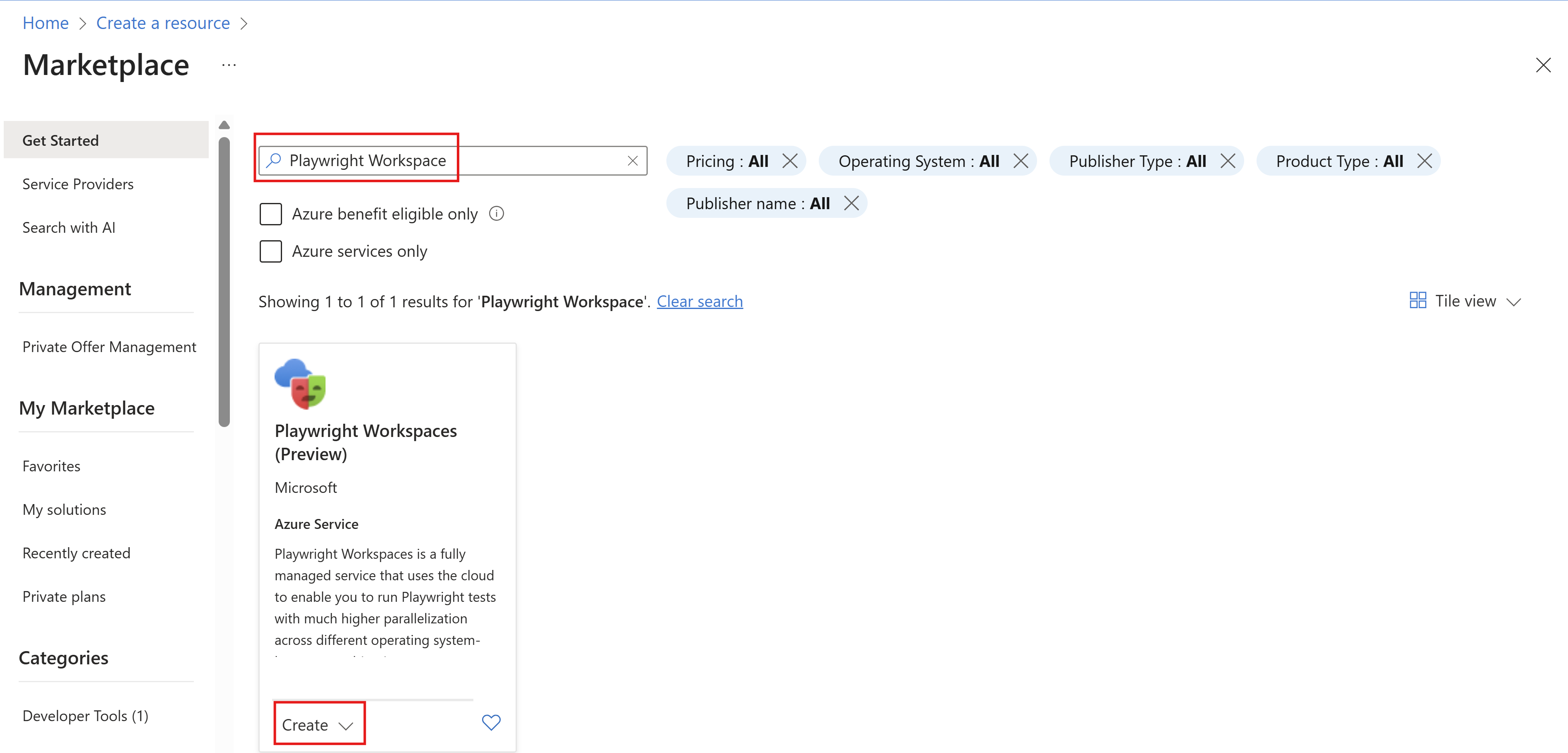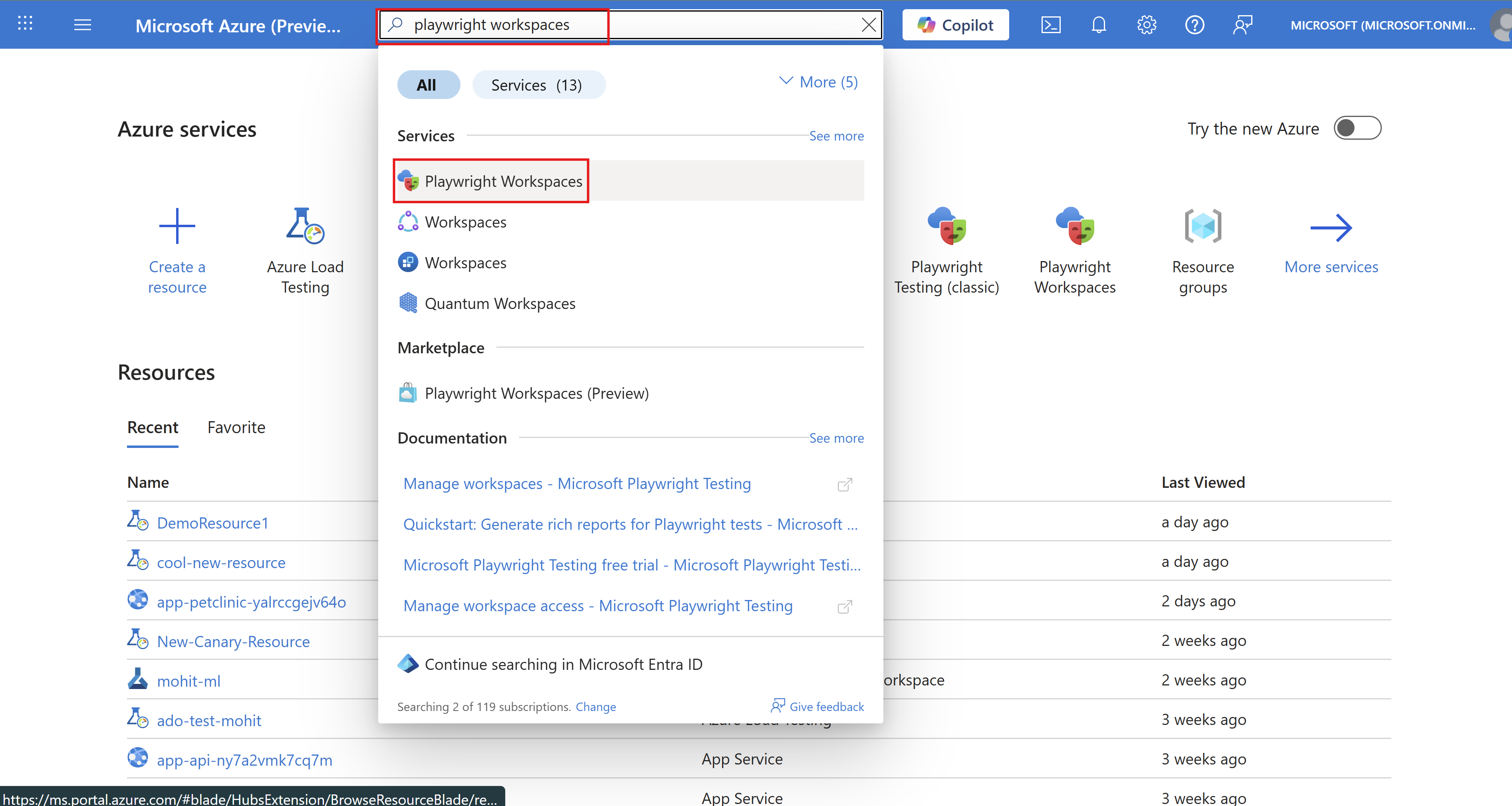 Select Playwright Workspaces from the Services section to view all your workspaces.