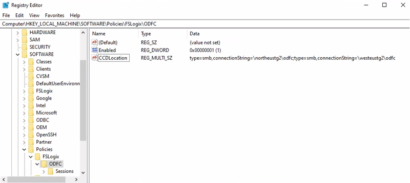 • Registry key path = HKEY_LOCAL_MACHINE > SOFTWARE > Policy > FSLogix > ODFC