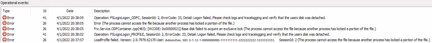 6. In the default FSLogix and cloud cache configuration, the user can't sign in, FSLogix records the error ERROR_LOCK_VIOLATION 33 (0x21) in the diagnostic logs.