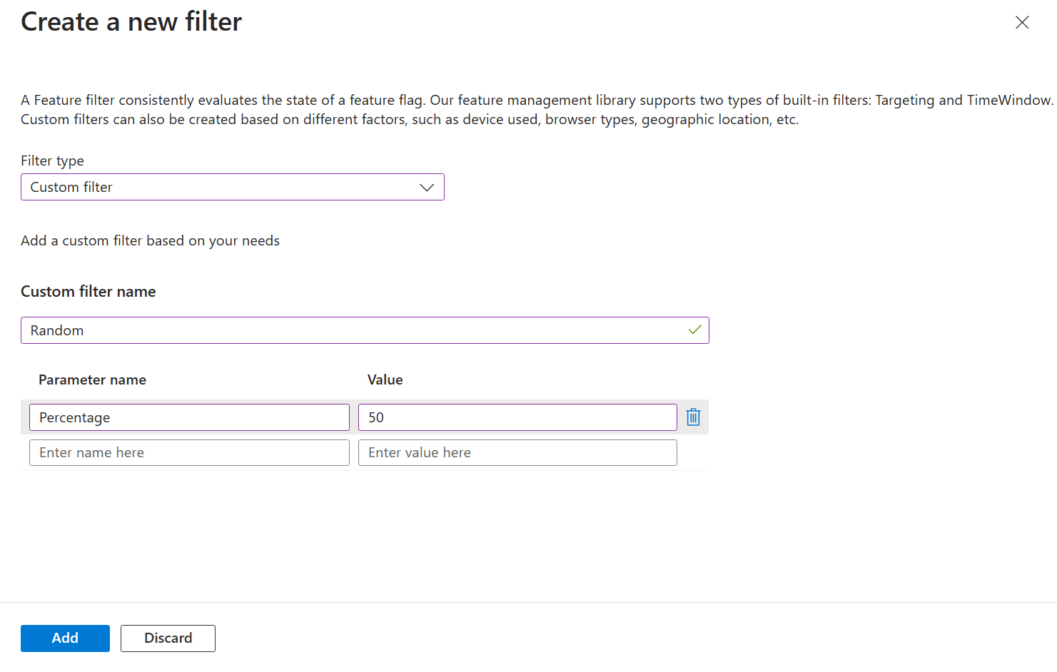 Feature filters can optionally use parameters for configurable conditions. In this example, you configure the filter to turn on the feature flag with a 50 percent chance. When you implement the filter in your code, you use the specified percentage and a random number to evaluate the state of the feature flag.