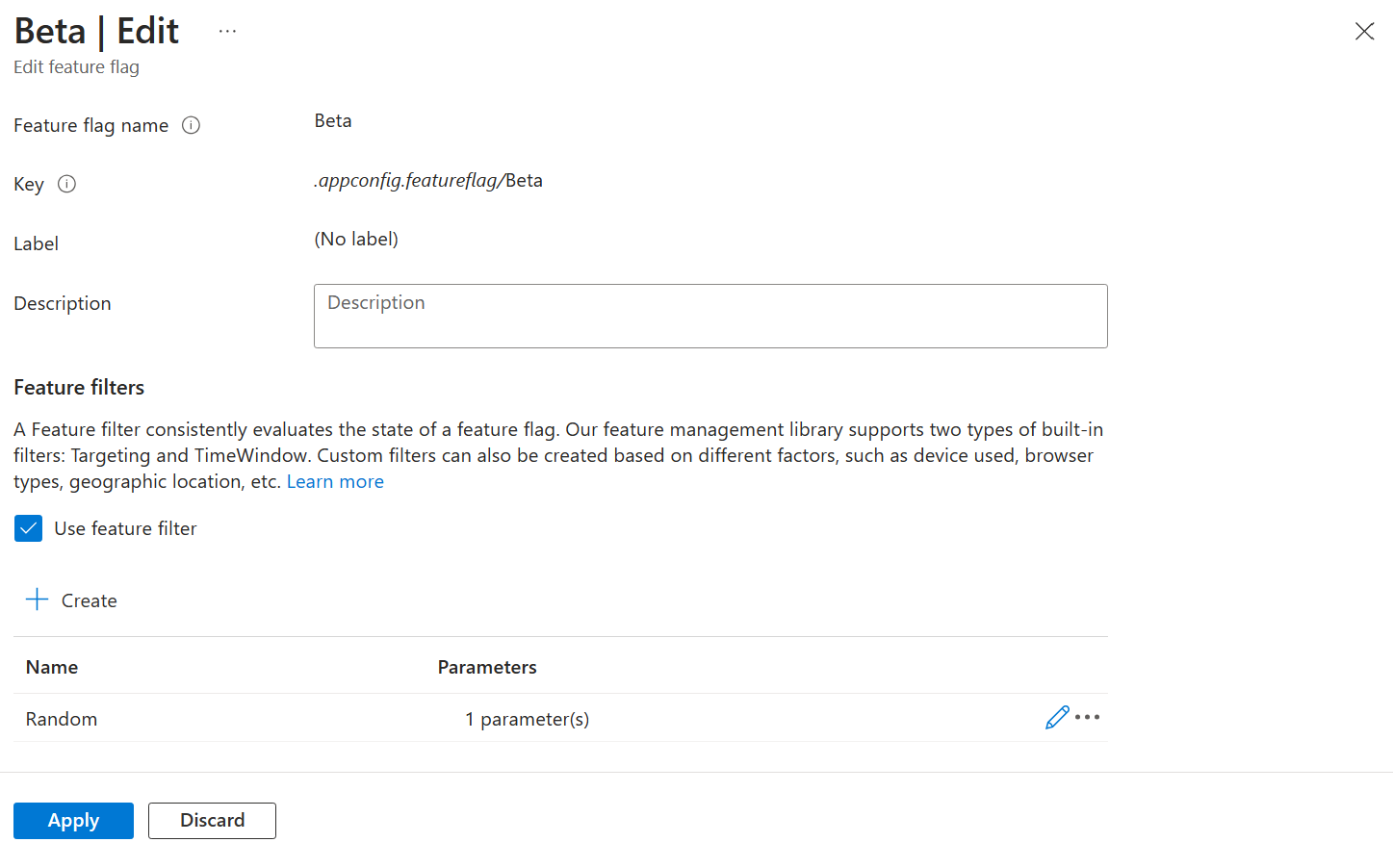 In the Edit feature flag dialog, select Enable feature flag if it isn't already selected. Select Use feature filter, and then select Create.
