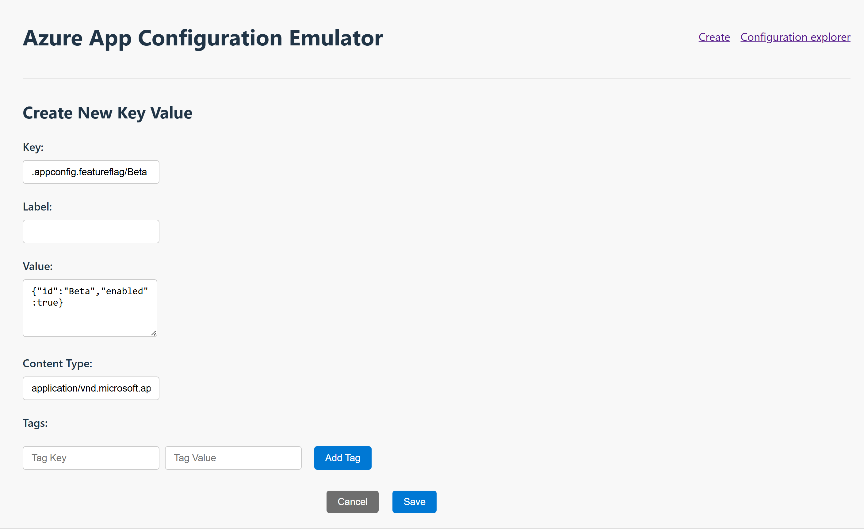 | .appconfig.featureflag/Beta | application/vnd.microsoft.appconfig.ff+json;charset=utf-8 | {"id":"Beta","enabled":false} |