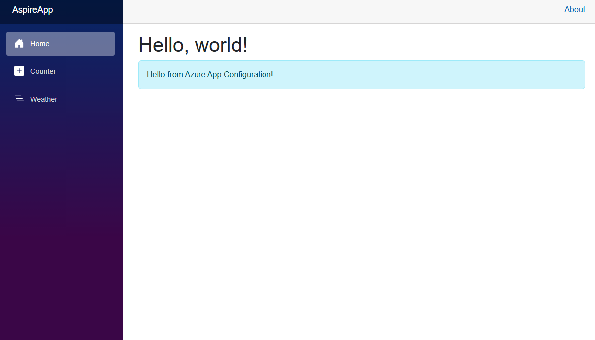 IVariantFeatureManagerat the top of the file.@inject IVariantFeatureManager FeatureManager <div class="top-row ps-3 navbar navbar-dark"> <div class="container-fluid"> <a class="navbar-brand" href="">AspireApp</a> </div> </div>Add the following code.