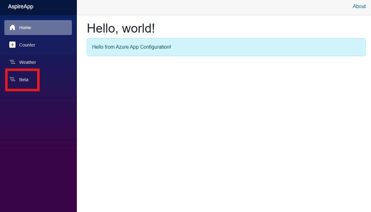 AppHostproject. Go to the Aspire dashboard and open the web app.In the Azure portal, navigate to the Feature manager of your App Configuration store and locate the Beta feature flag. Enable the flag by selecting the checkbox under Enabled.