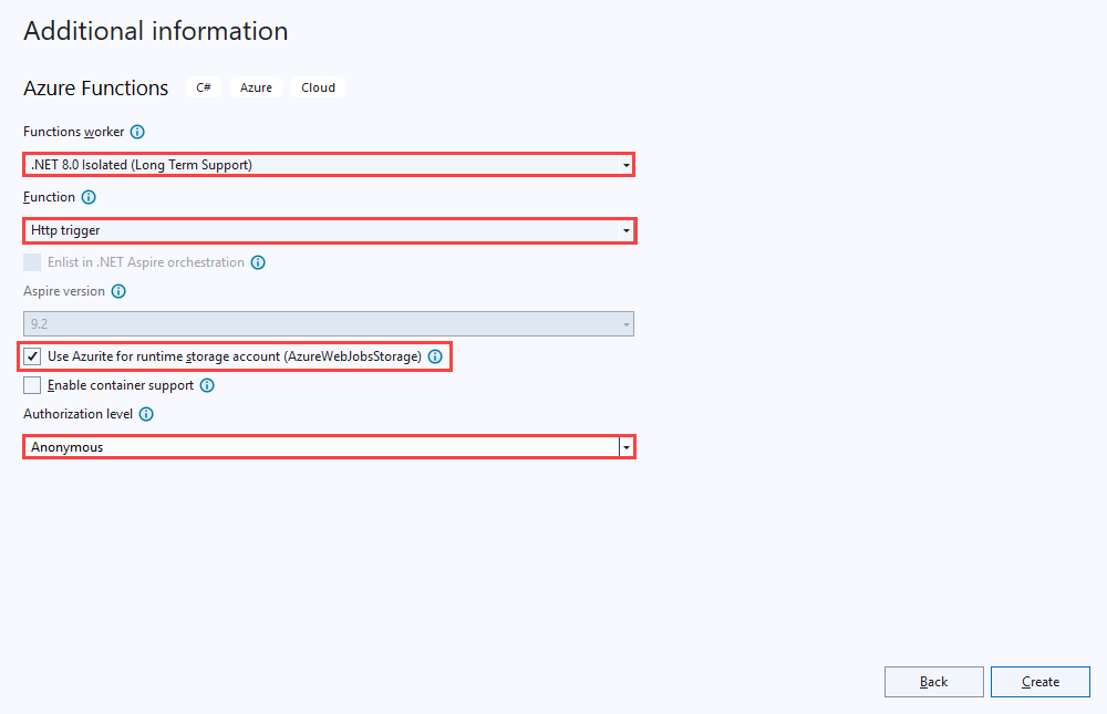 Setting Action Description Functions worker Select .NET 8.0 Isolated (Long Term Support). Visual Studio creates a function project that runs in an isolated worker process. The isolated worker process also supports other versions of .NET and .NET Framework that don't offer long term support (LTS). For more information, see Azure Functions runtime versions overview. Function Select Http trigger. Visual Studio creates a function triggered by an HTTP request. Use Azurite for runtime storage account (AzureWebJobsStorage) Select this checkbox. Because a function app in Azure requires a storage account, one is assigned or created when you publish your project to Azure. An HTTP trigger doesn't use a Storage account connection string. All other trigger types require a valid Storage account connection string. Authorization level Select Anonymous. When you use this authorization setting, any client can trigger the created function without providing a key. This configuration makes it easy to test your new function. For more information, see Authorization level. Setting Action Description Functions worker Select .NET 8.0 In-process (Long Term Support). Visual Studio creates a function project that runs in-process with version 4.x of the Functions runtime. For more information, see Azure Functions runtime versions overview. Function Select Http trigger. Visual Studio creates a function triggered by an HTTP request. Use Azurite for runtime storage account (AzureWebJobsStorage) Select this checkbox. Because a function app in Azure requires a storage account, one is assigned or created when you publish your project to Azure. An HTTP trigger doesn't use a Storage account connection string. All other trigger types require a valid Storage account connection string. Authorization level Select Anonymous When you use this authorization setting, any client can trigger the created function without providing a key. This configuration makes it easy to test your new function. For more information, see Authorization level. Make sure you set the Authorization level to Anonymous. If you select the default level of Function, you're required to present the function key in requests to access your function endpoint.