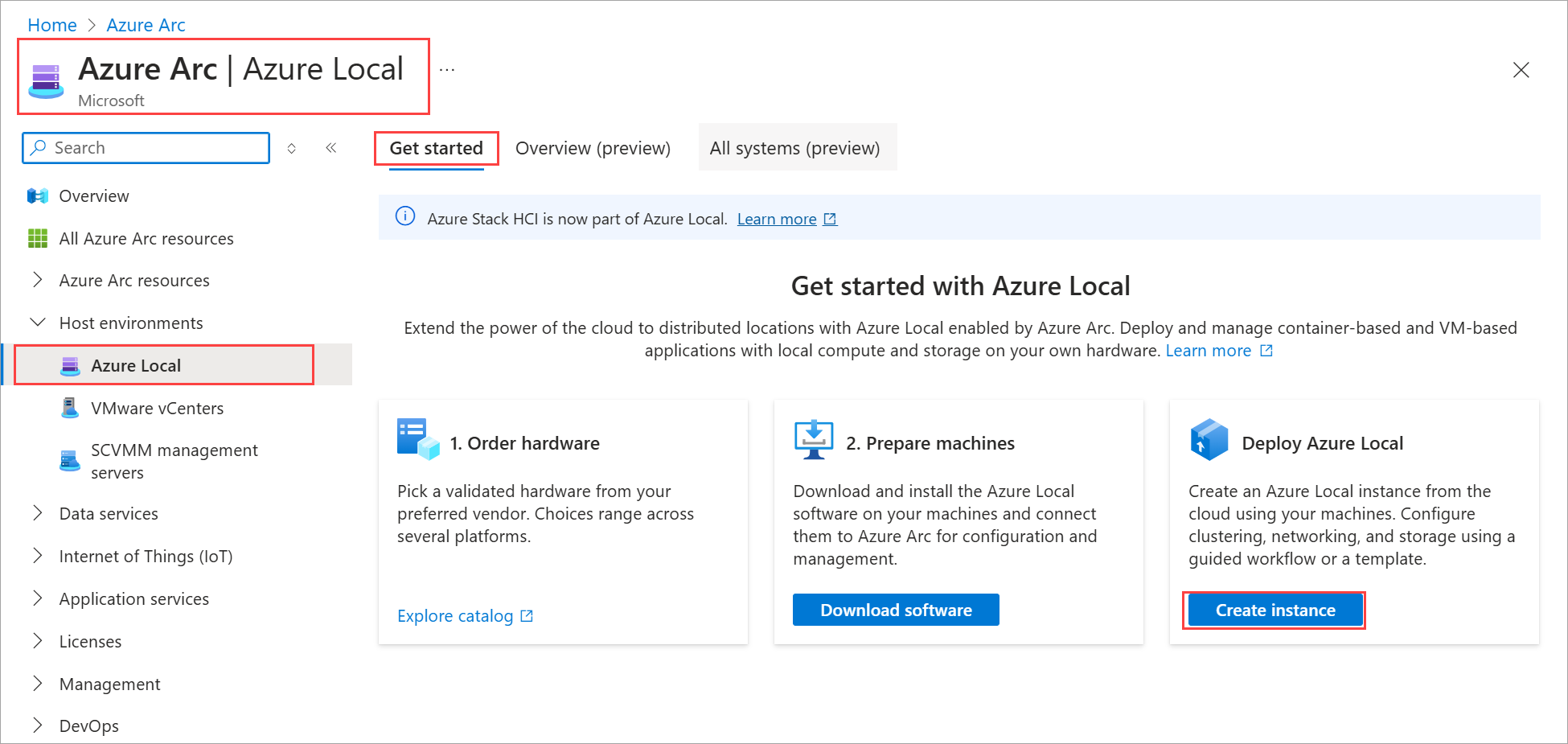 On the Azure Arc > Azure Local page, go to the Get started tab.
