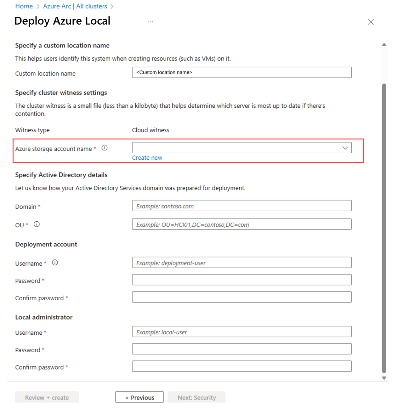 A cluster witness is required for rack aware cluster. Select an existing Storage account or create a new Storage account to store the cloud witness file.