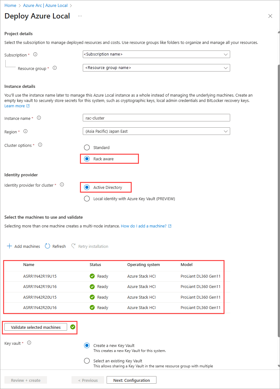 In this step, select Rack aware cluster for the Cluster options. If you select this option, you can only deploy with Active Directory. Local identity with key vault is not supported for rack aware clusters in this release.