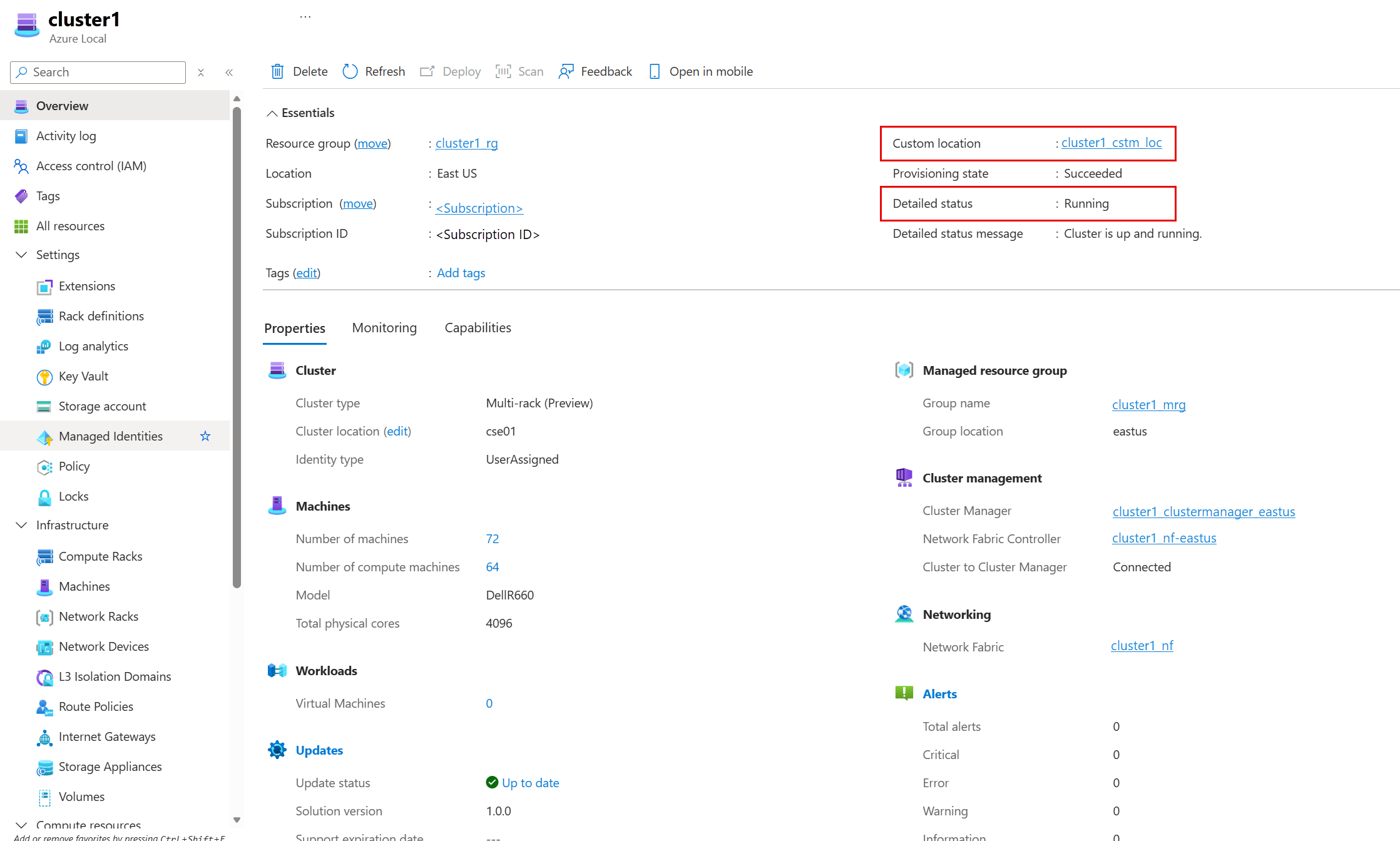 Go to the Overview page in the Azure Local resource. Verify that Detailed Status shows as Running. You should also see a custom/extended location in the cluster overview page.