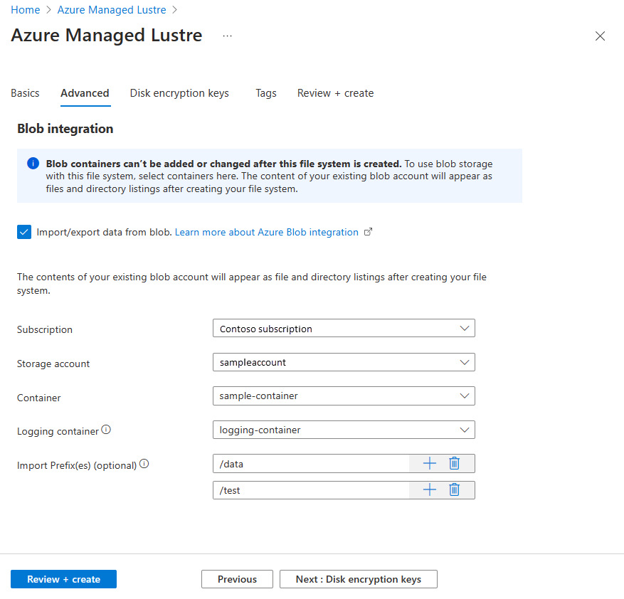 If you want to integrate data from Azure Blob Storage with your Azure Managed Lustre file system, you can specify the details in the Blob integration section when you create the file system.