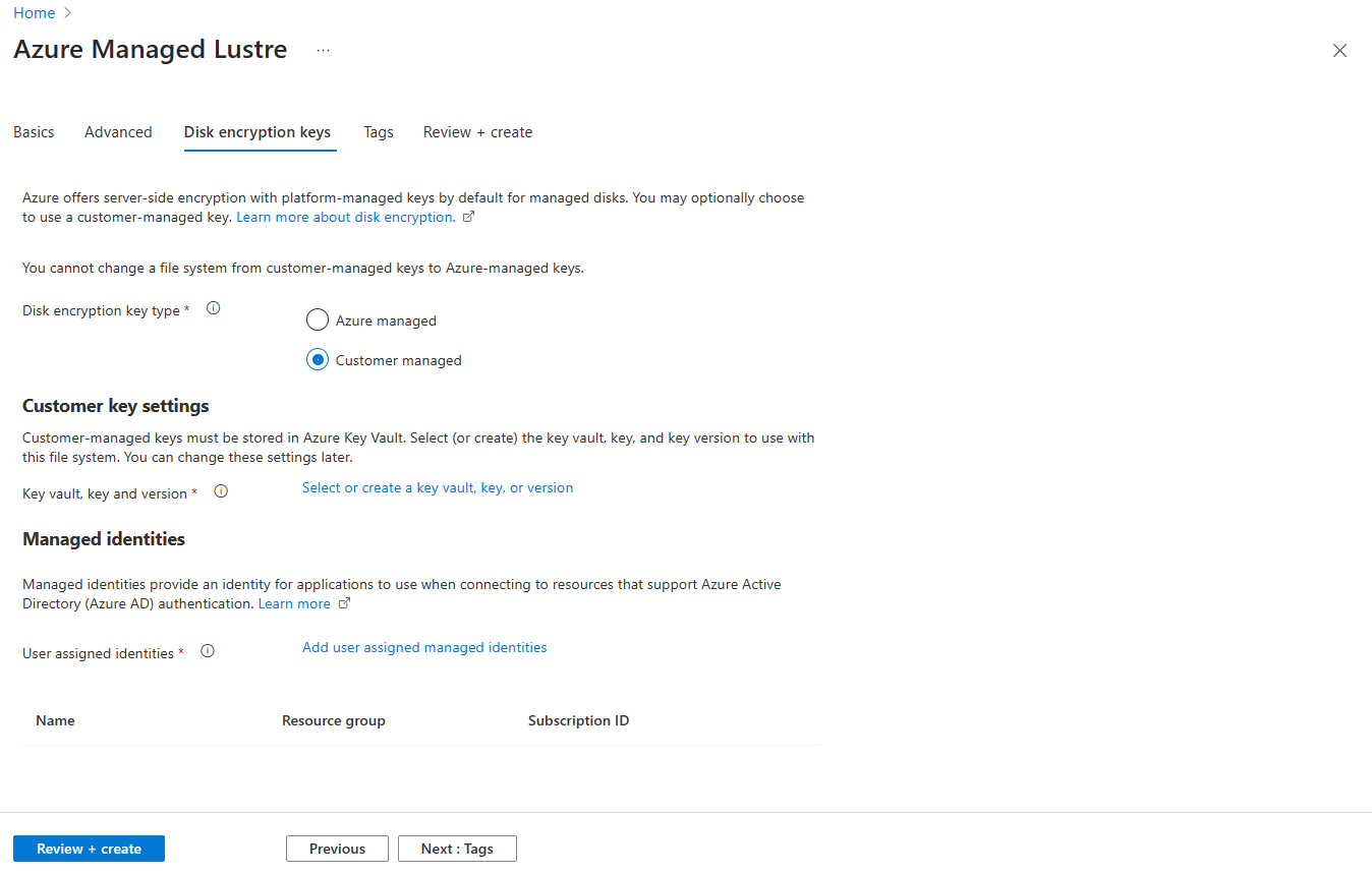 You can optionally manage the encryption keys for your Azure Managed Lustre file system storage by supplying your Azure Key Vault information on the Disk encryption keys tab. The key vault must be in the same region and in the same subscription as the cache.