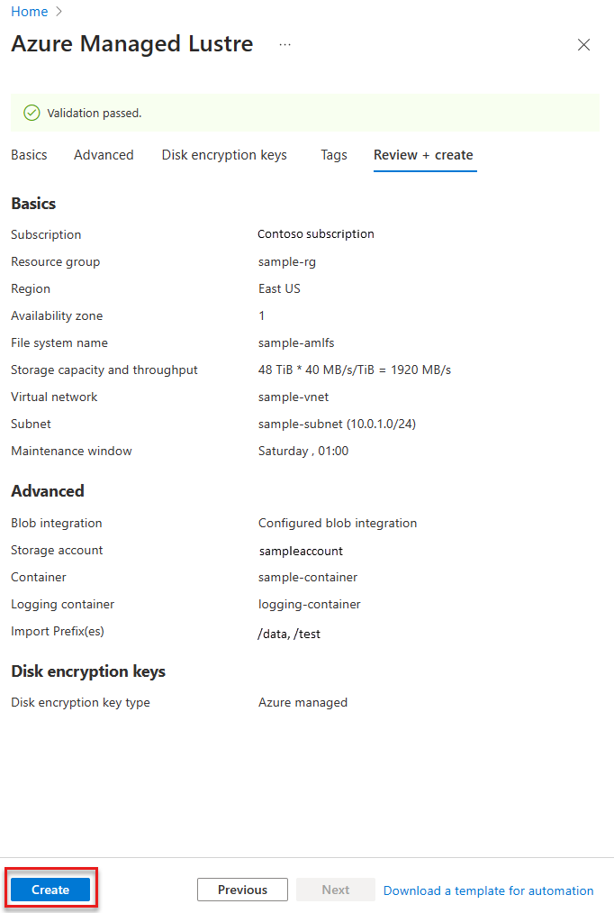 When you go to the Review + create tab, Azure runs validation on your settings for the Azure Managed Lustre file system. If validation passes, you can proceed to create the file system.