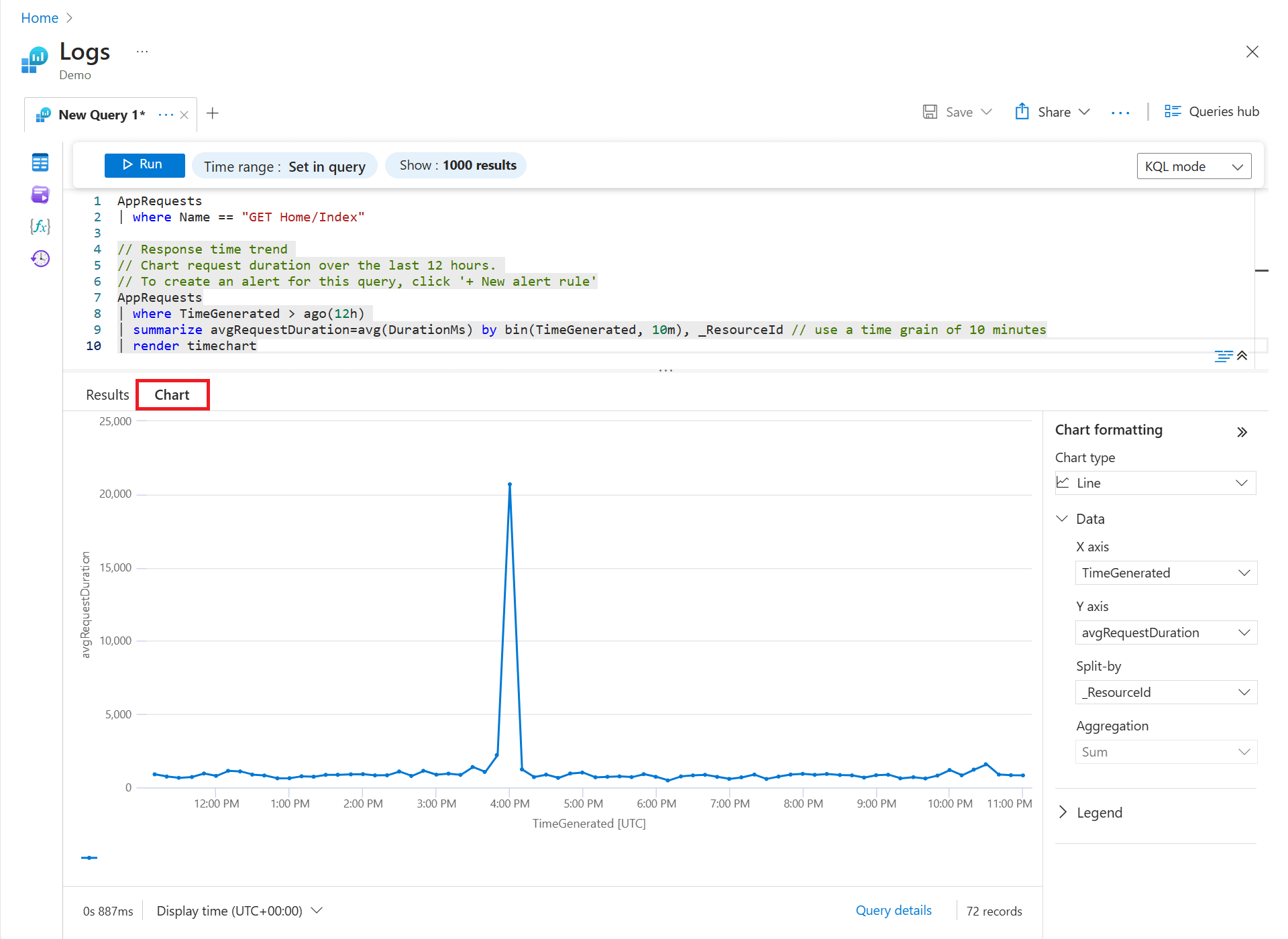 Load the Response time trend query in the Applications category to the editor. To do so, double-click the query or hover over the query name to show more information, then select Load to editor.
