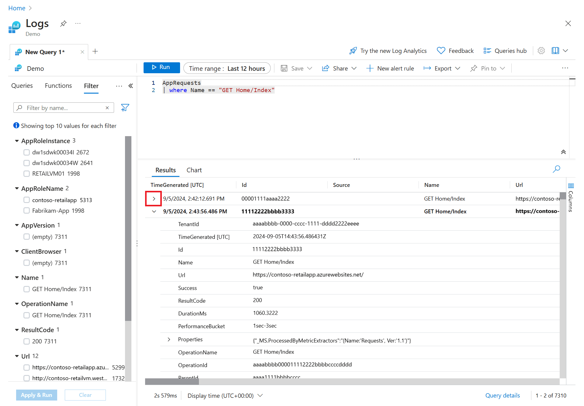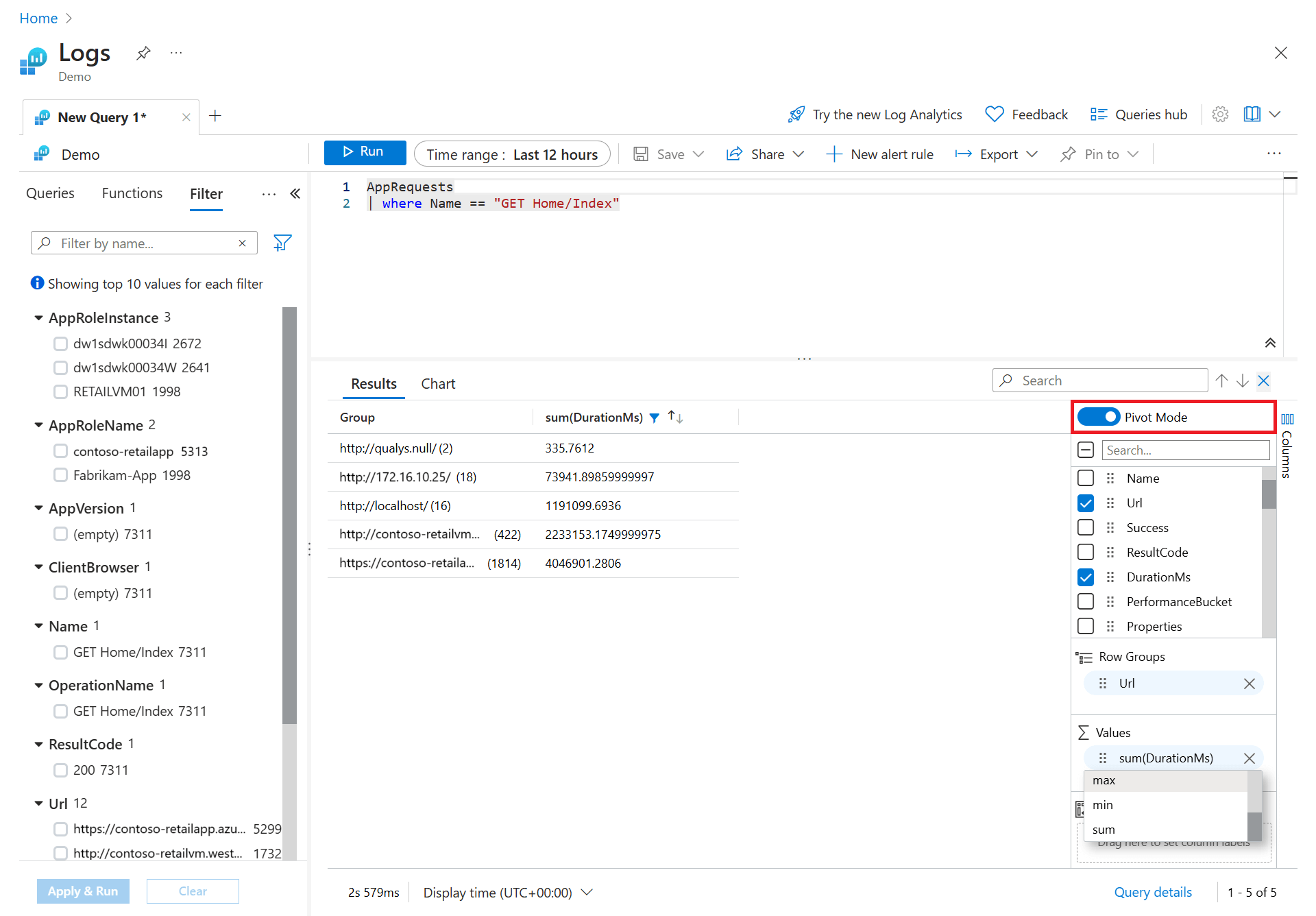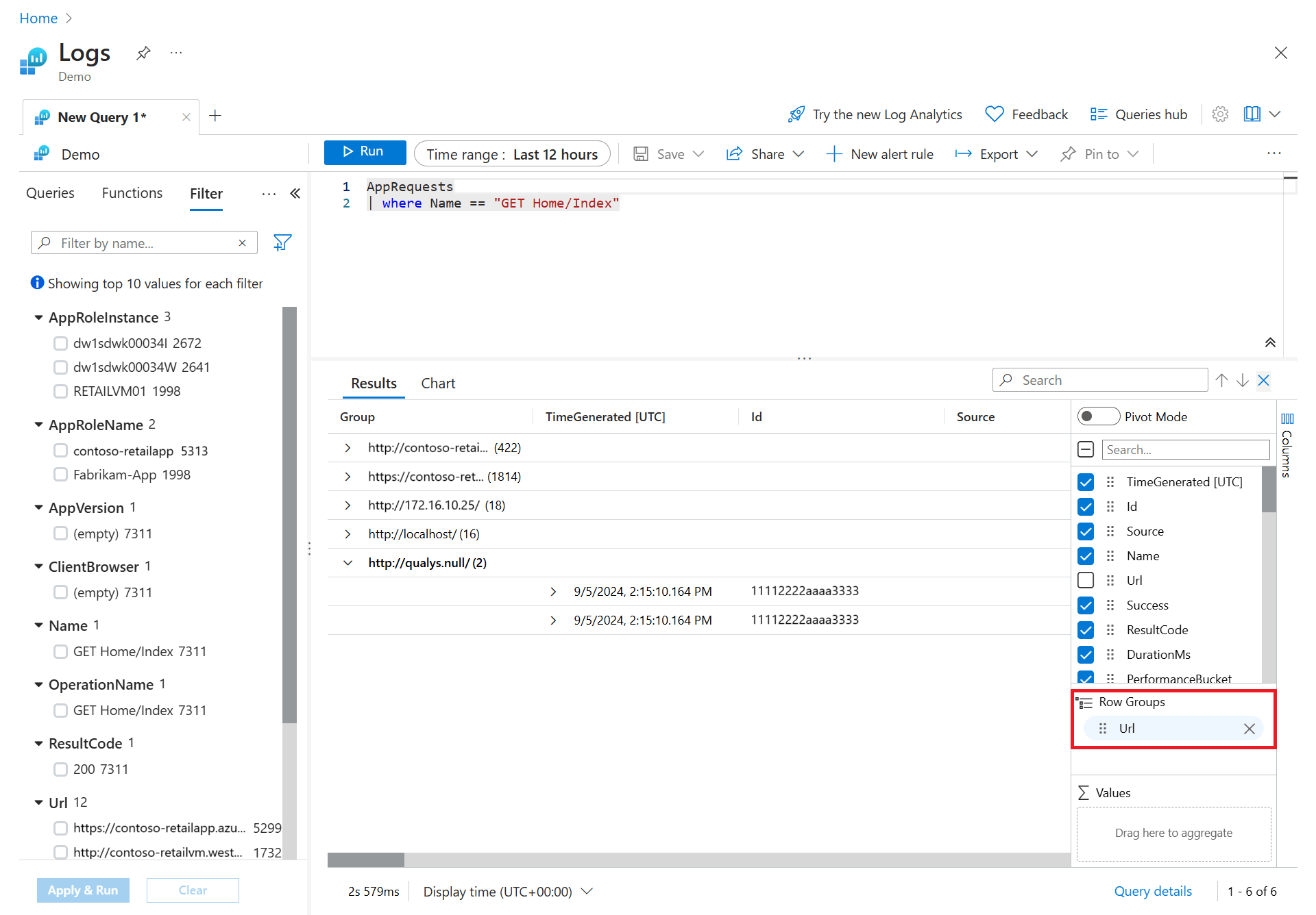 In the sidebar, you see a list of all available columns. Drag the Url column into the Row Groups section. Results are now organized by that column, and you can collapse each group to help you with your analysis. This action is similar to adding a filter condition to the query, but instead of refetching data from the server, you're processing the data your original query returned. When you run the query again, Log Analytics retrieves data based on your original query. Use this method if you want to quickly analyze a set of records as part of interactive analysis.