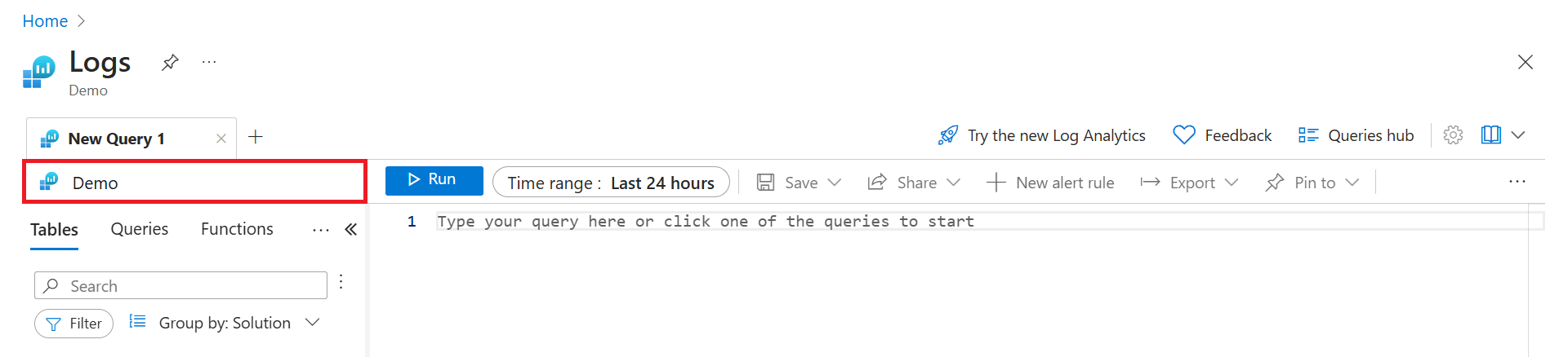 Open the Log Analytics demo environment, or select Logs from the Azure Monitor menu in your subscription. This step sets the initial scope to a Log Analytics workspace so that your query selects from all data in that workspace. If you select Logs from an Azure resource's menu, the scope is set to only record from that resource. For more information, see Log query scope.