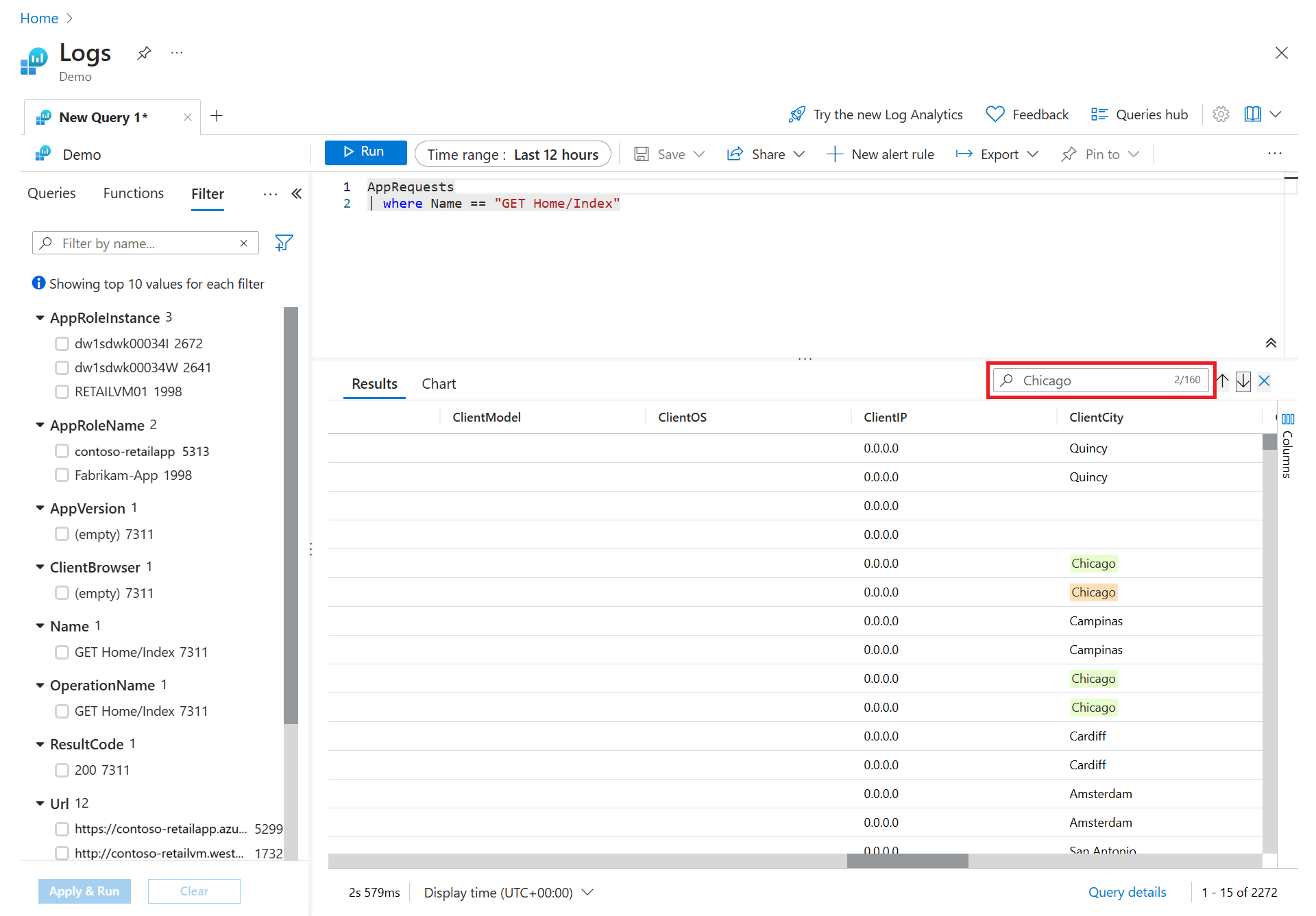 Enter Chicago in the query results search box, and select the arrows to find all instances of this string in your search results.