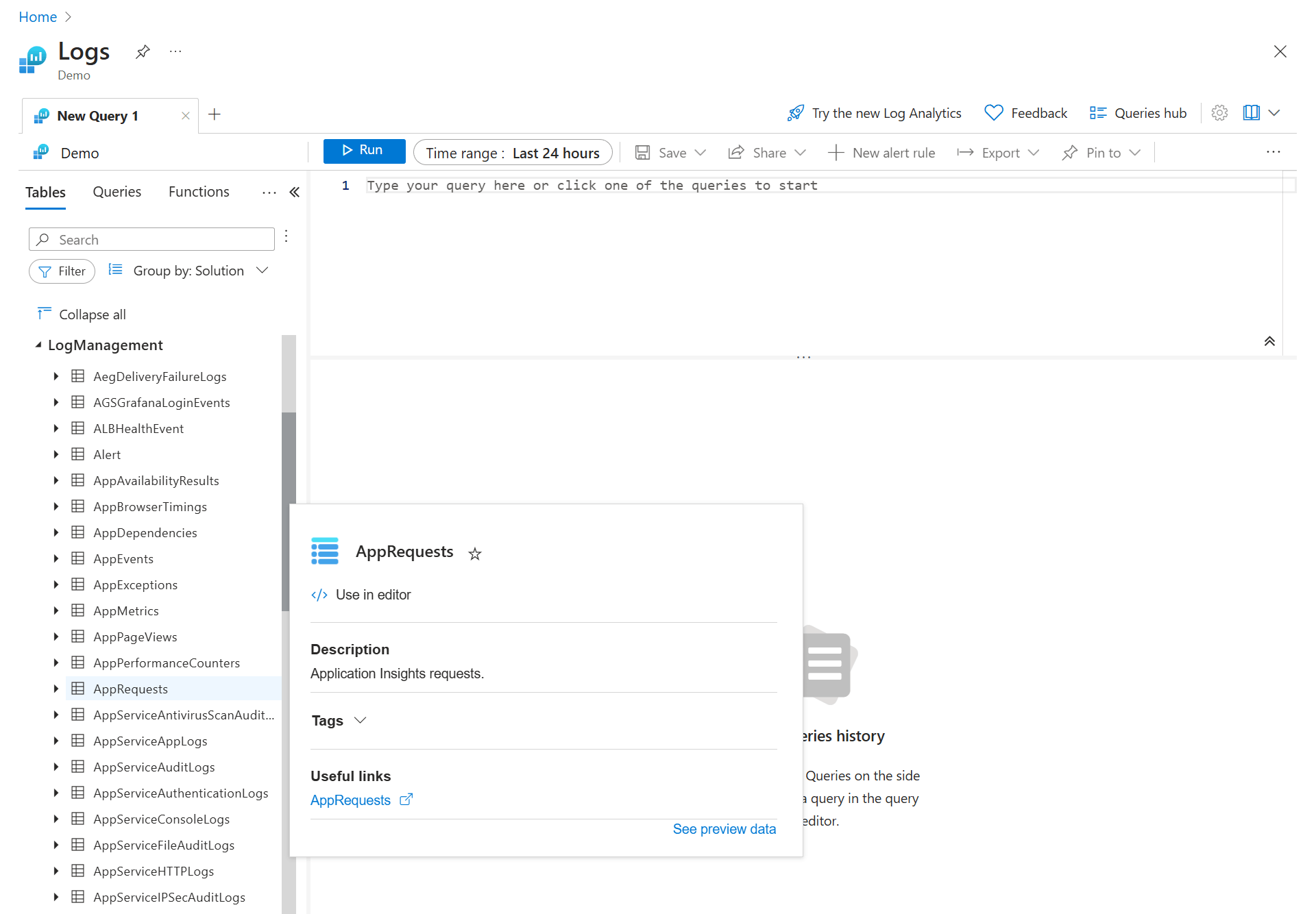 Expand the Log Management solution and locate the AppRequests table. You can expand the table to view its schema, or hover over its name to show more information about it.