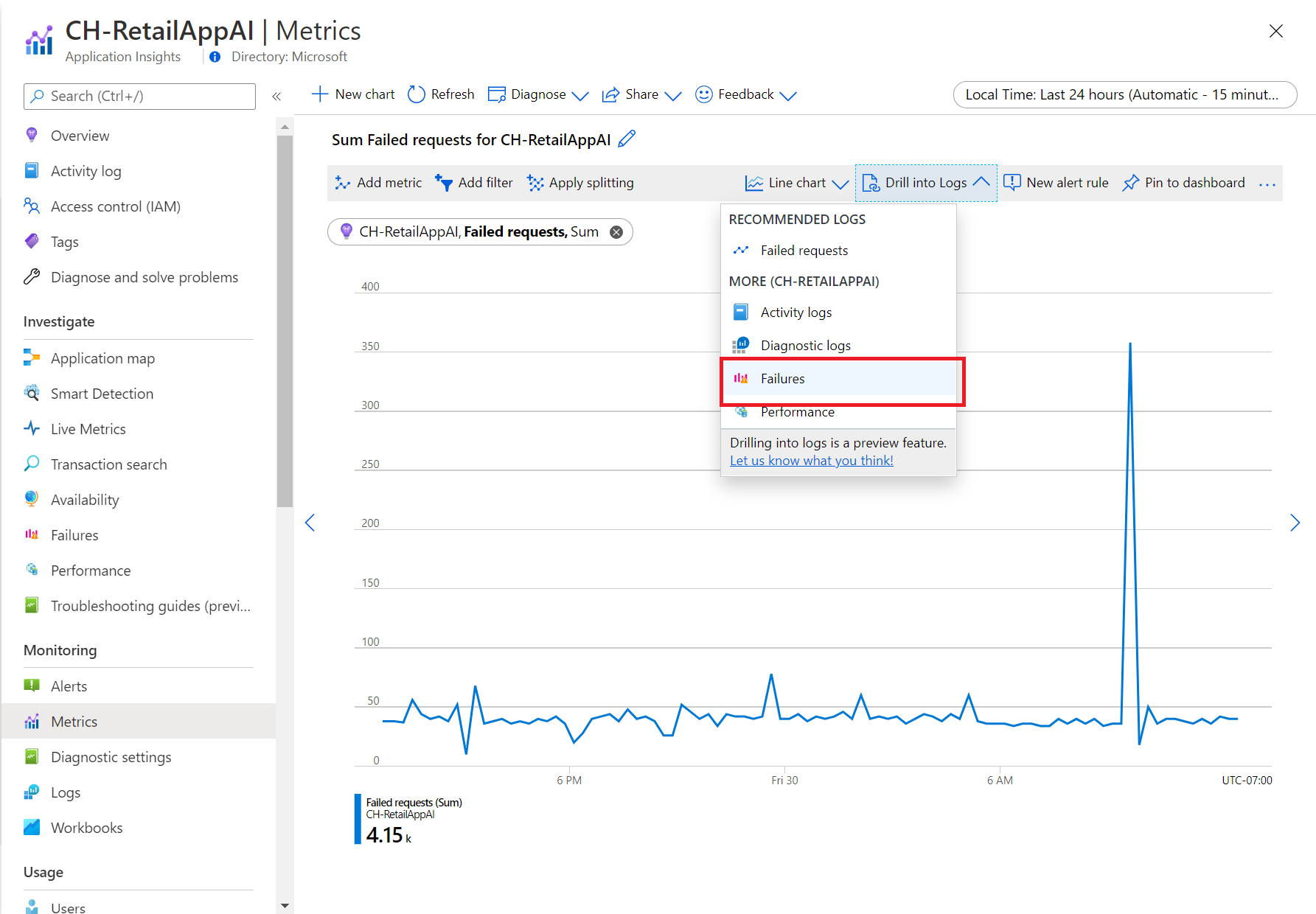 To diagnose a spike in failed requests, select Drill into Logs.