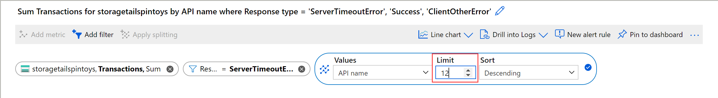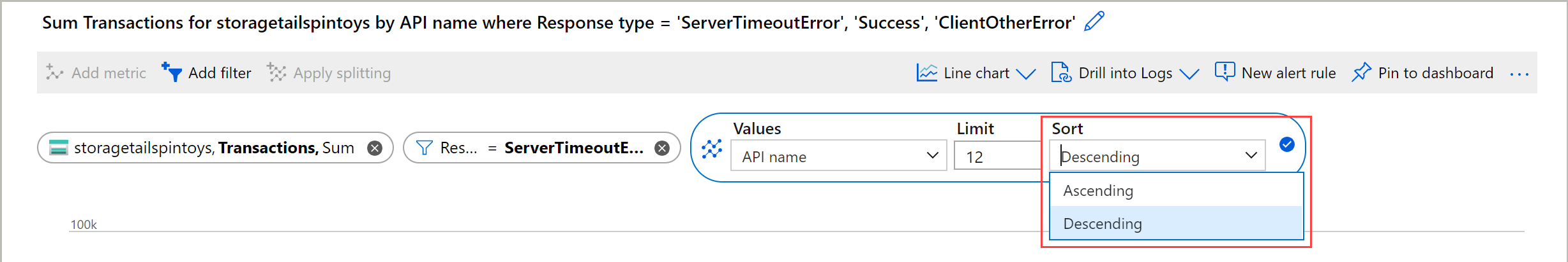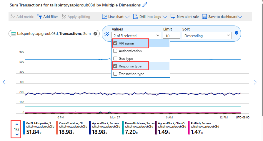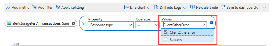 =).Select which dimension values you want to apply to the filter when you're plotting the chart. This example shows filtering out the successful storage transactions.