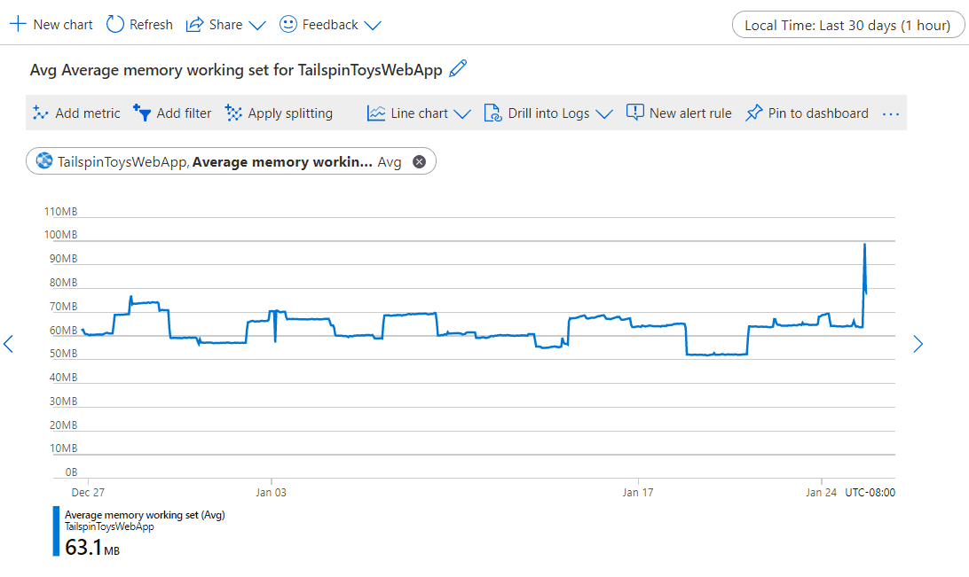The time picker lets you configure the time range for your metric chart to view data that's relevant to your monitoring scenario. By default, the chart shows the most recent 24 hours of metrics data.