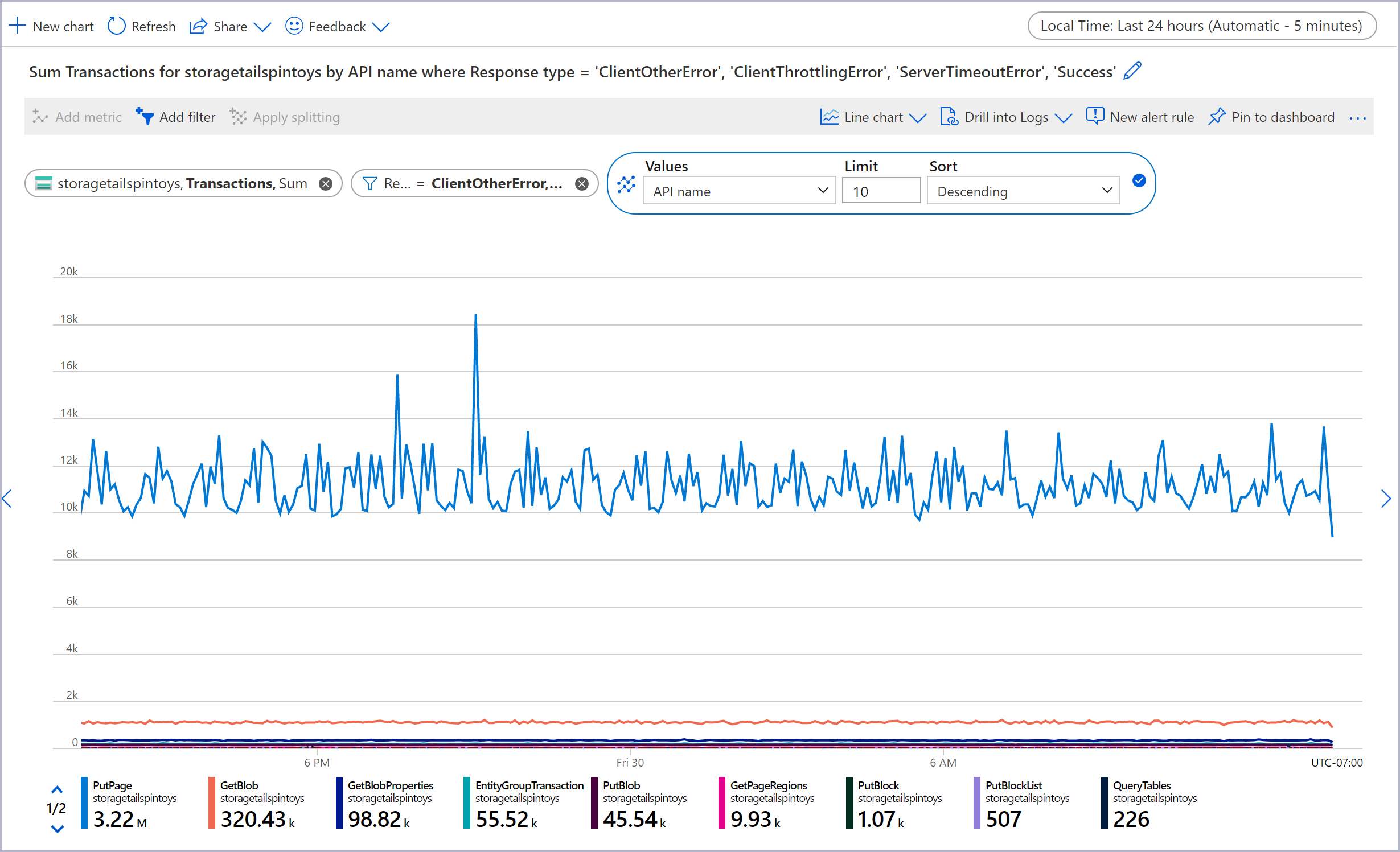 After you select the filter values, click outside the filter picker to complete the action. The chart shows how many storage transactions have failed.