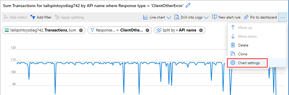 You can apply filters to charts whose metrics have dimensions. Consider a Transaction count metric that has a Response type dimension. This dimension indicates whether the response from transactions succeeded or failed. If you filter on this dimension, metrics explorer displays a chart line for only successful or only failed transactions.