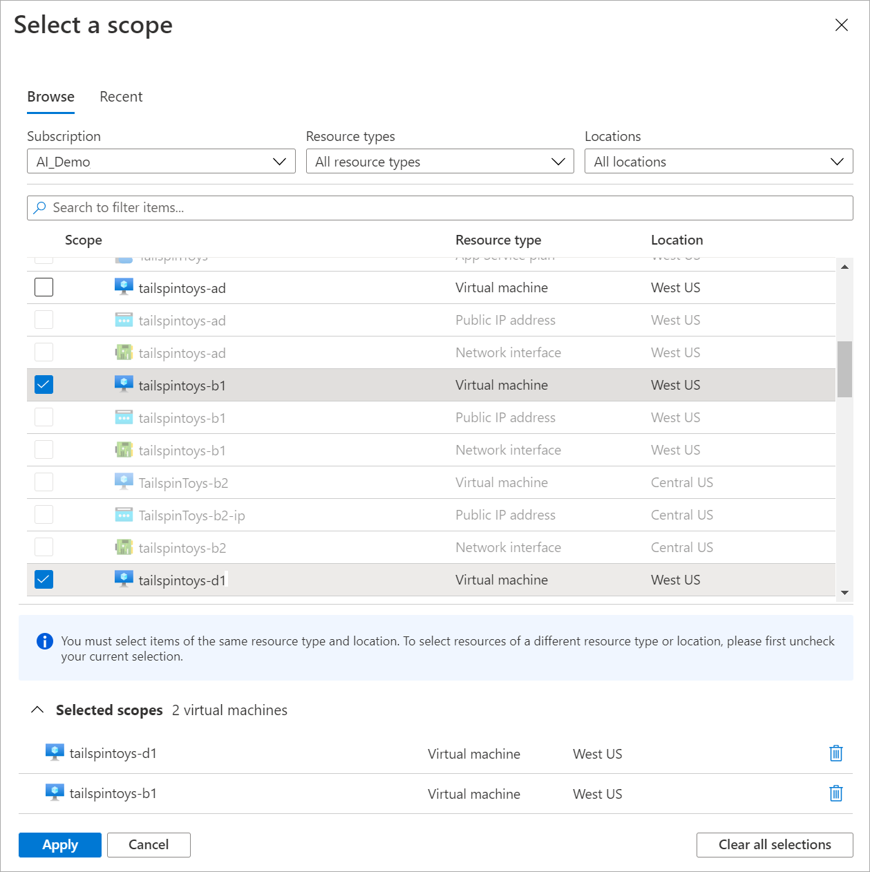 The resources you select must be within the same resource type, location, and subscription. Resources that don't meet these criteria aren't selectable.