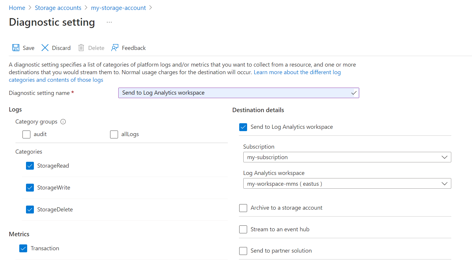 Enter a name for the diagnostic setting and select the categories that you want to collect. See the documentation for each service for a definition of its available categories. AllMetrics sends the same platform metrics for the resource to the workspace. This allows you to analyze this data with log queries along with other monitoring data. Select Send to Log Analytics workspace and then select the workspace that you created.