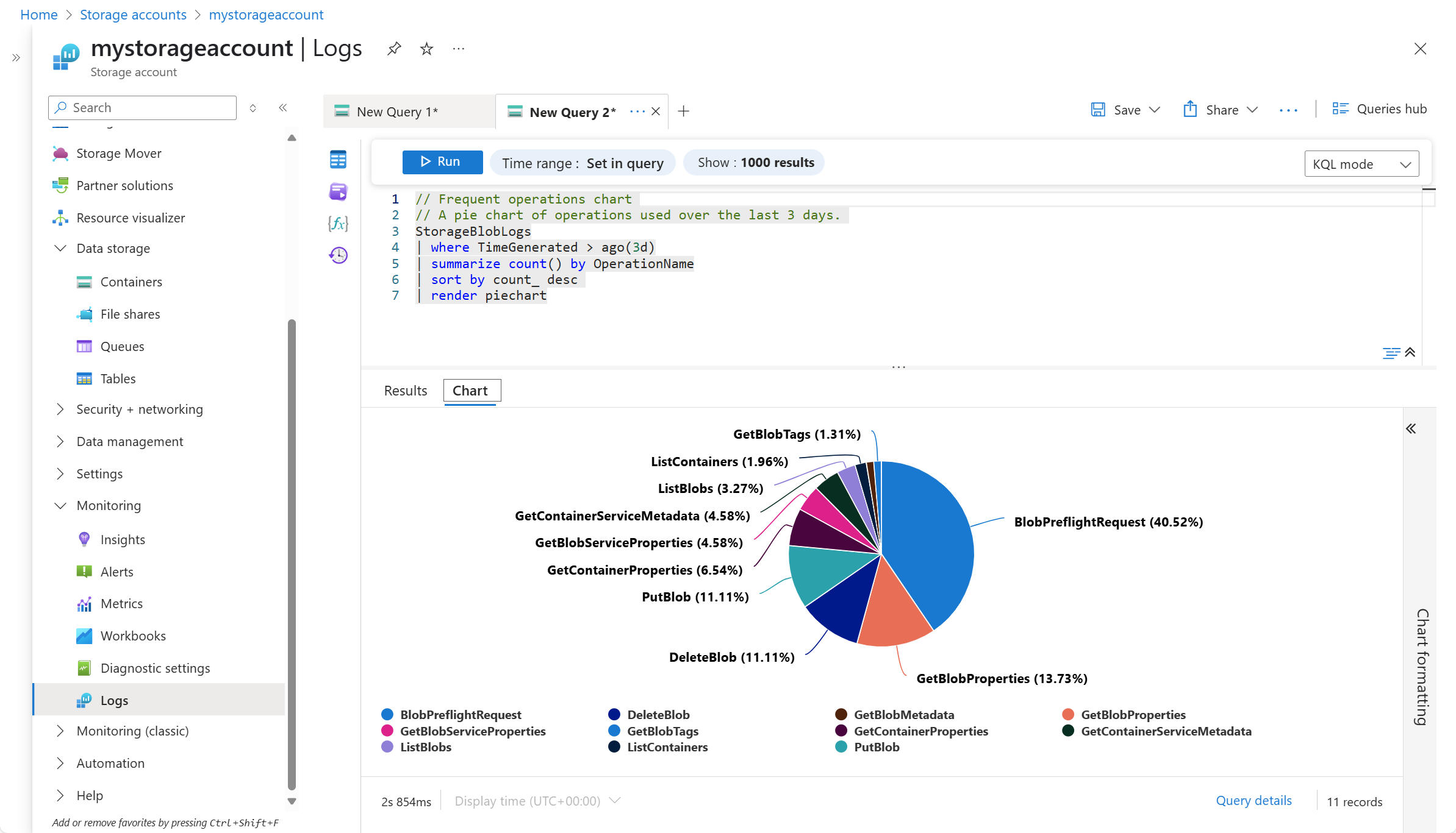Select Logs from your resource's menu. Log Analytics opens with the Queries hub window that includes prebuilt queries for your resource type.